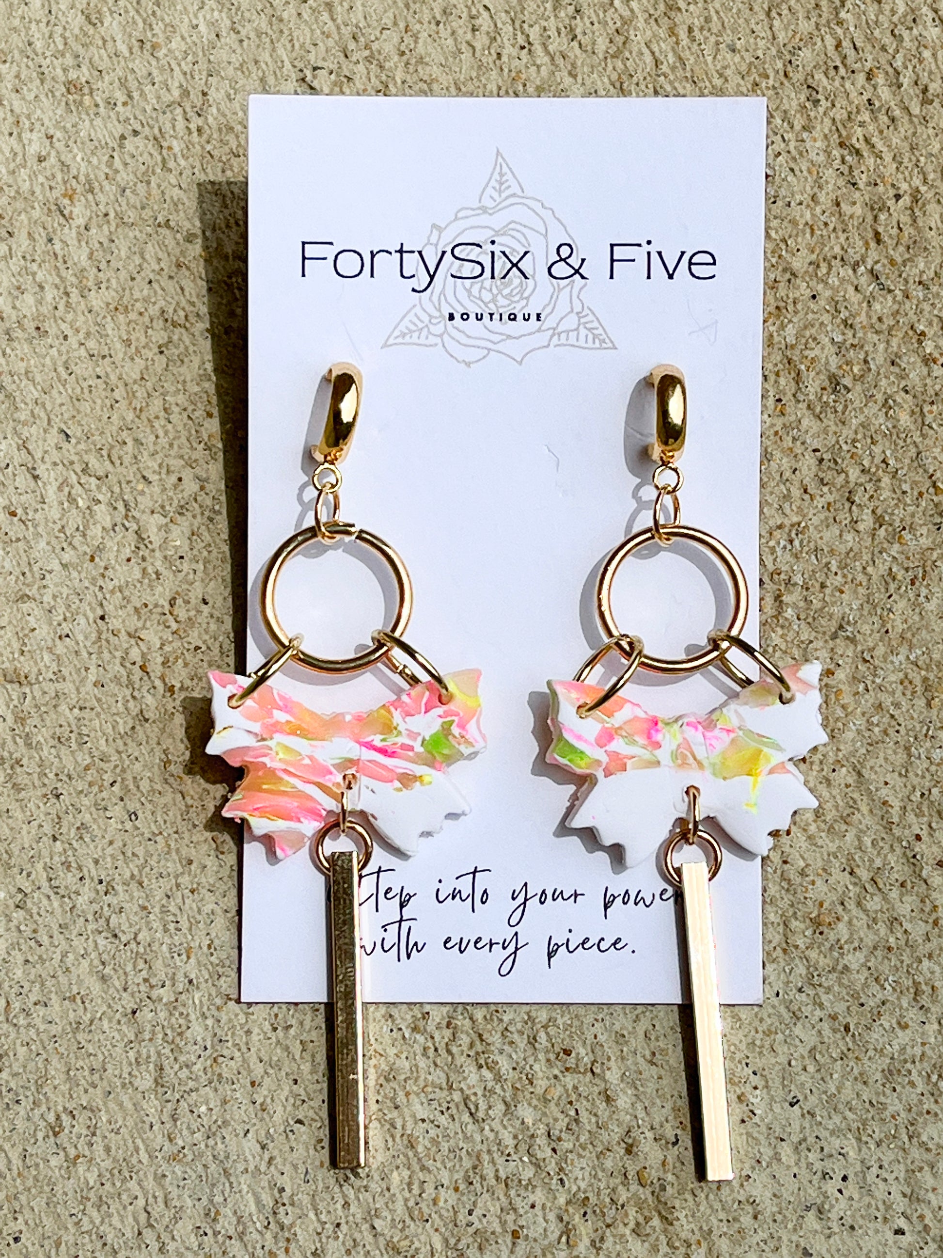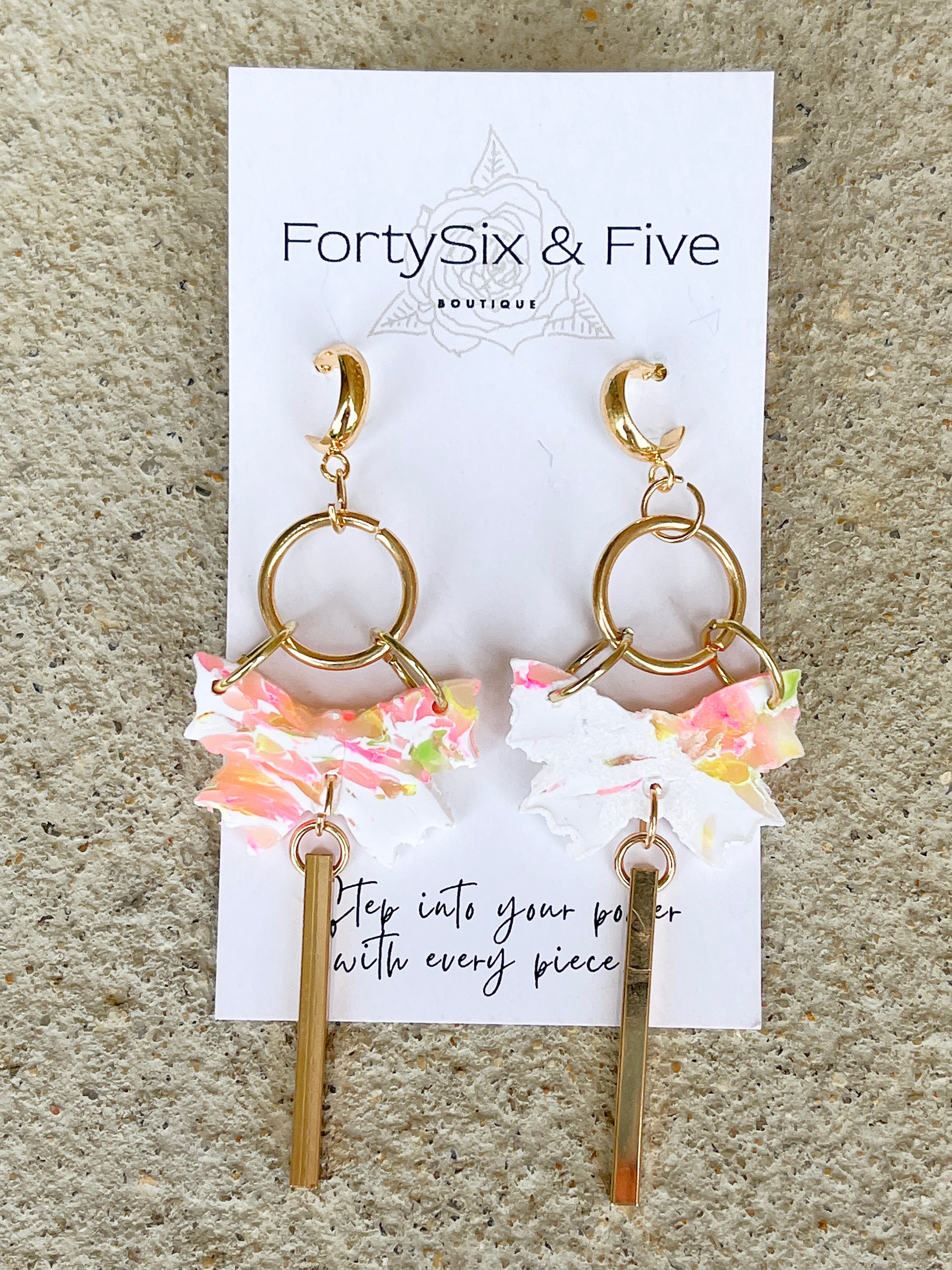 THE APRICOT Carmen is a custom one of a kind earring. It is perfect for summer with its mixed vibrant pinks, yellows, greens and touches of gold! It can be worn with a subtle basic white and jeans or dressed up for an amazing night out. Because it subtly “ does the most”… it will give just the perfect accent without overdoing it! Try them out and see what everyone is raving about!