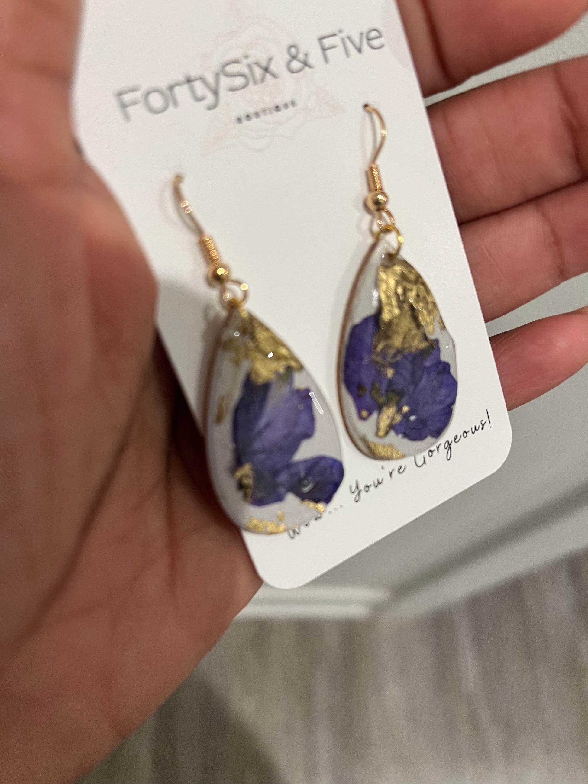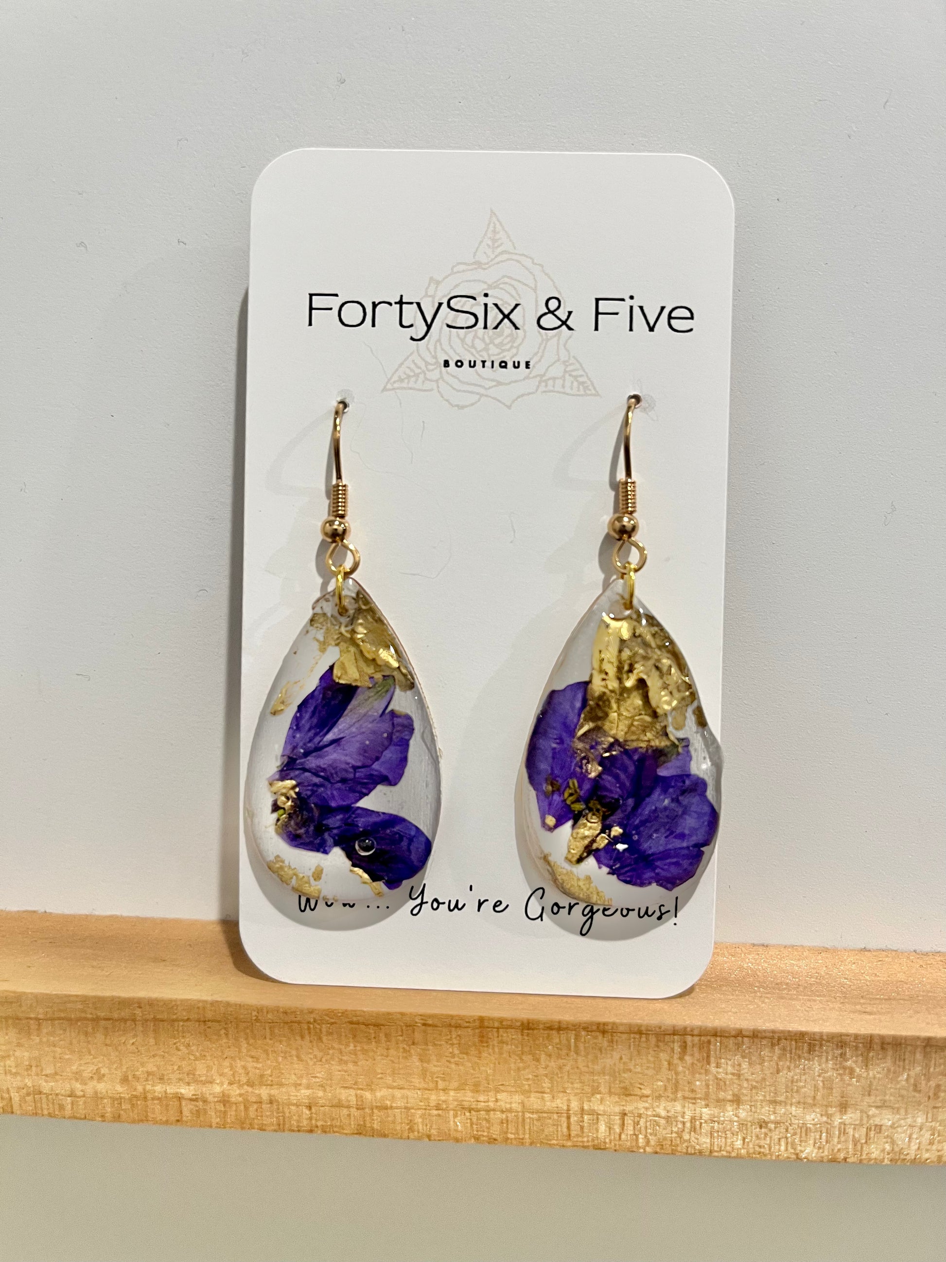 Get ready to turn heads with the one-of-a-kind earrings! These handmade wooden earrings are a stunning 1 inch long and feature gorgeous gold foil and purple pressed flower accents.