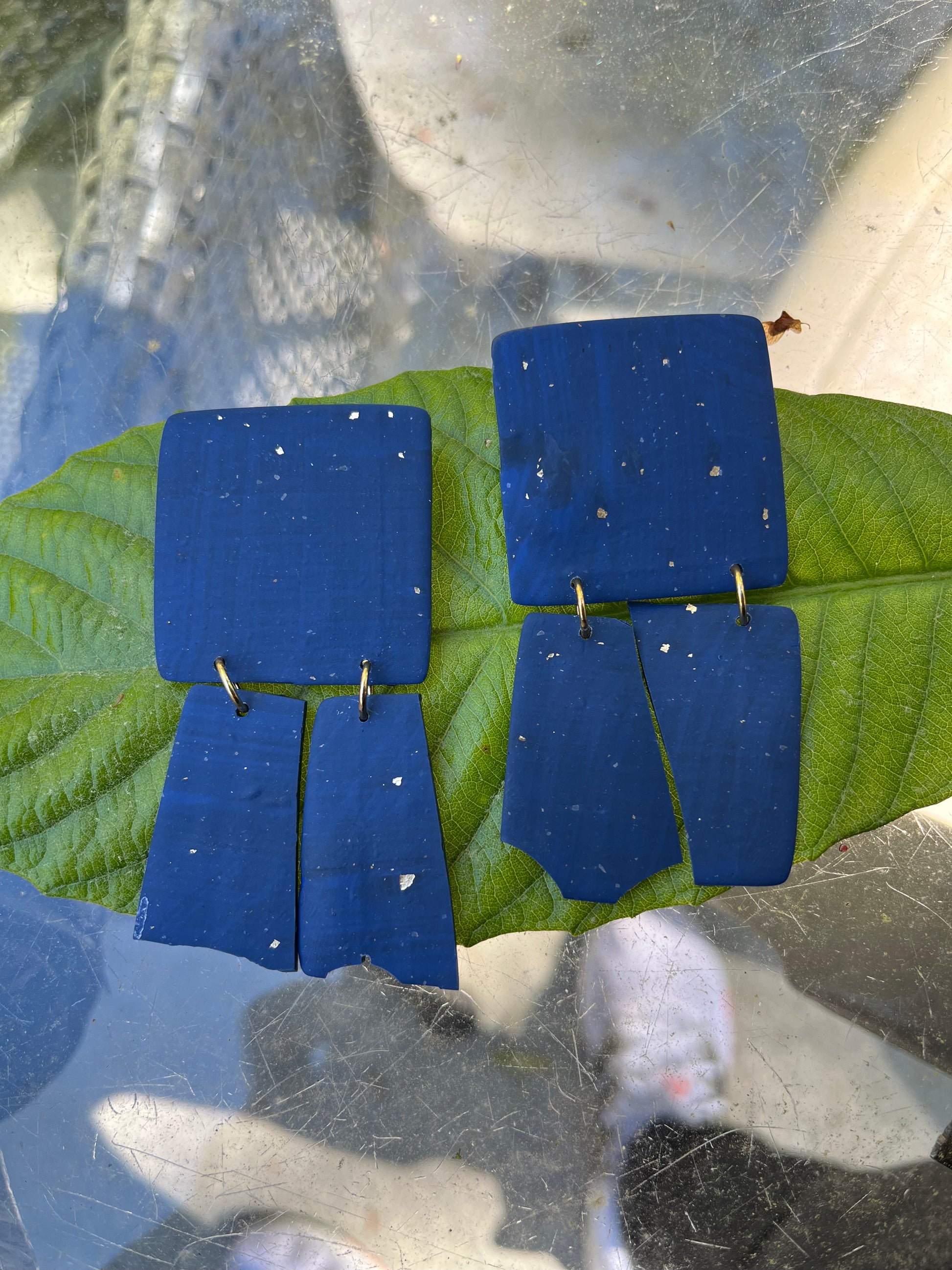 Experience the bold and edgy style of our Blue Jean ABSTRACT studs. These asymmetrical earrings are inspired by denim and make a statement with their abstract design. Made with flecks of gold for the perfect , subtle shimmer and extremely lightweight polymer clay, each pair is carefully handmade by me to ensure quality. Their 3 inch length adds drama to any outfit, making them perfect for any occasion. From casual to formal, these earrings can elevate any look.
