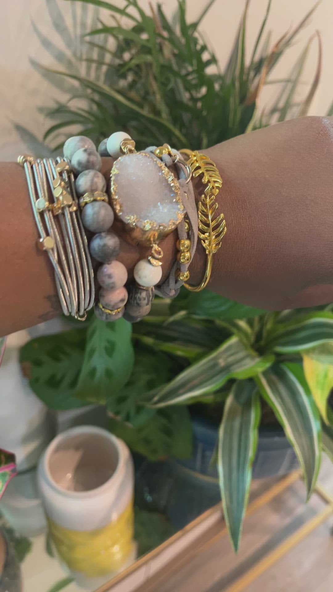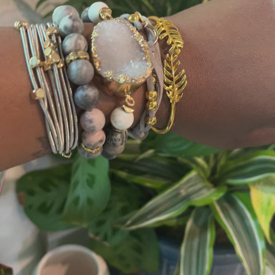 This is an elegant, boho luxury bracelet set that offers a beautiful grey, soft pink and gold neutral palette that can be worn at ANY event and for any occasion. We are so pleased to be offering this BEAUTIFUL new addition to the FortySixandFive Boutique!