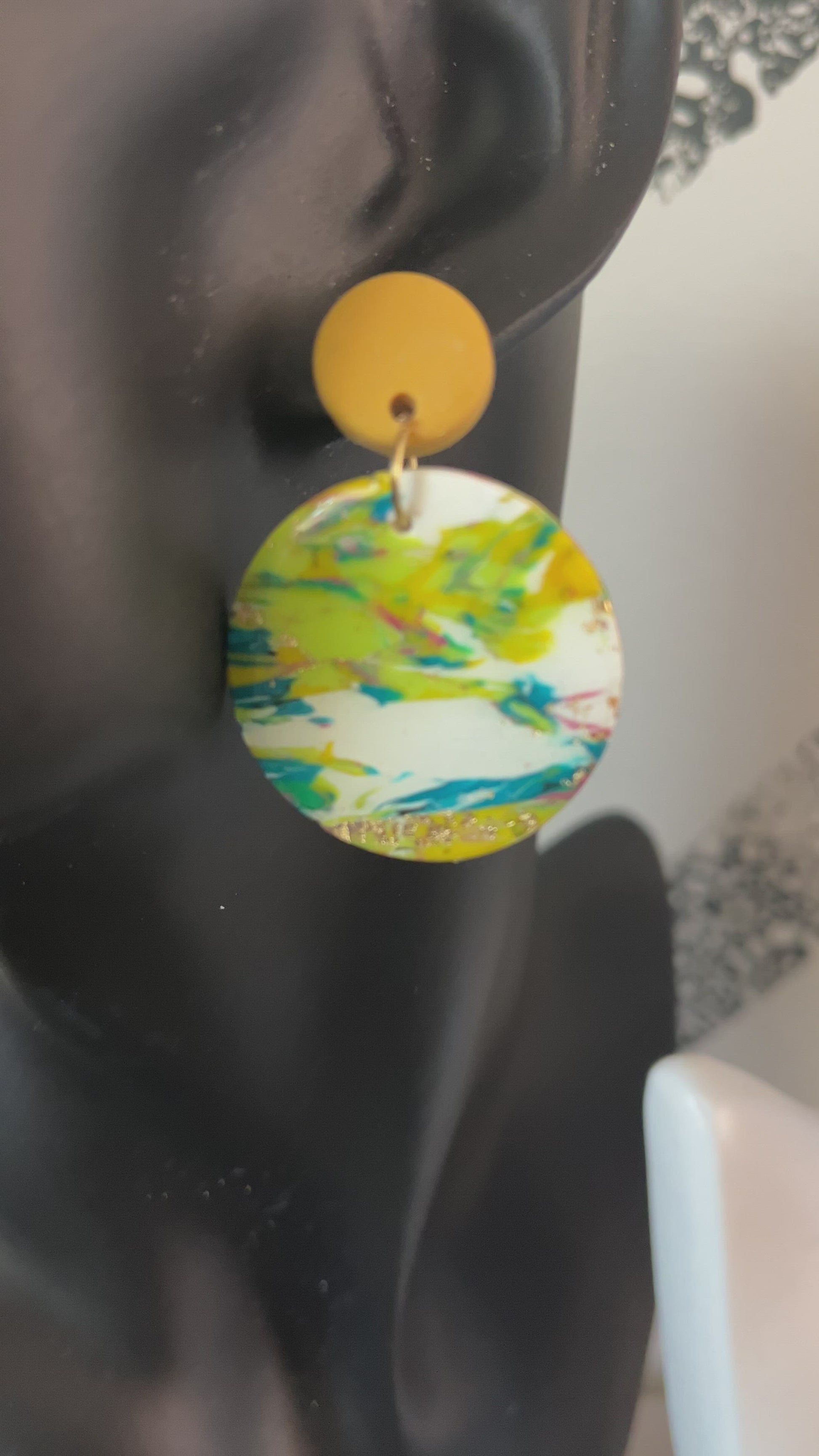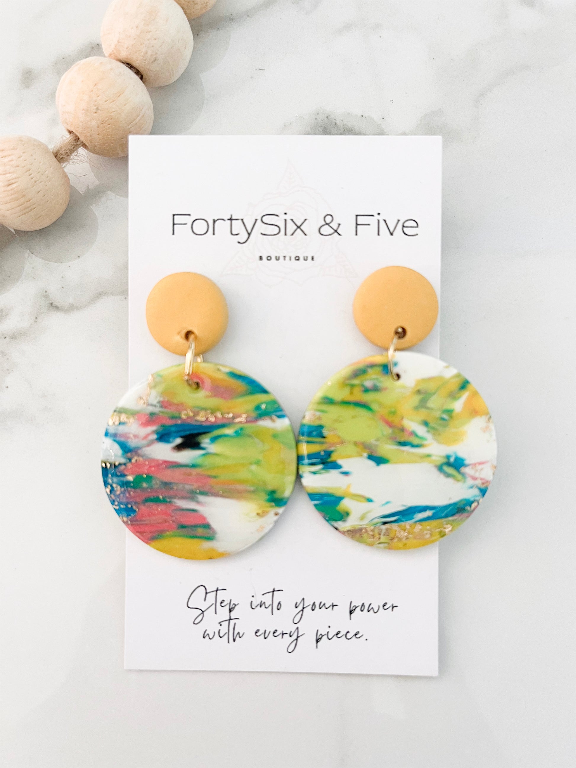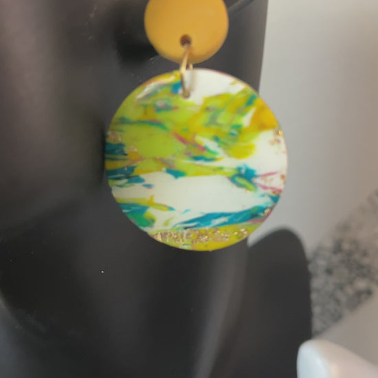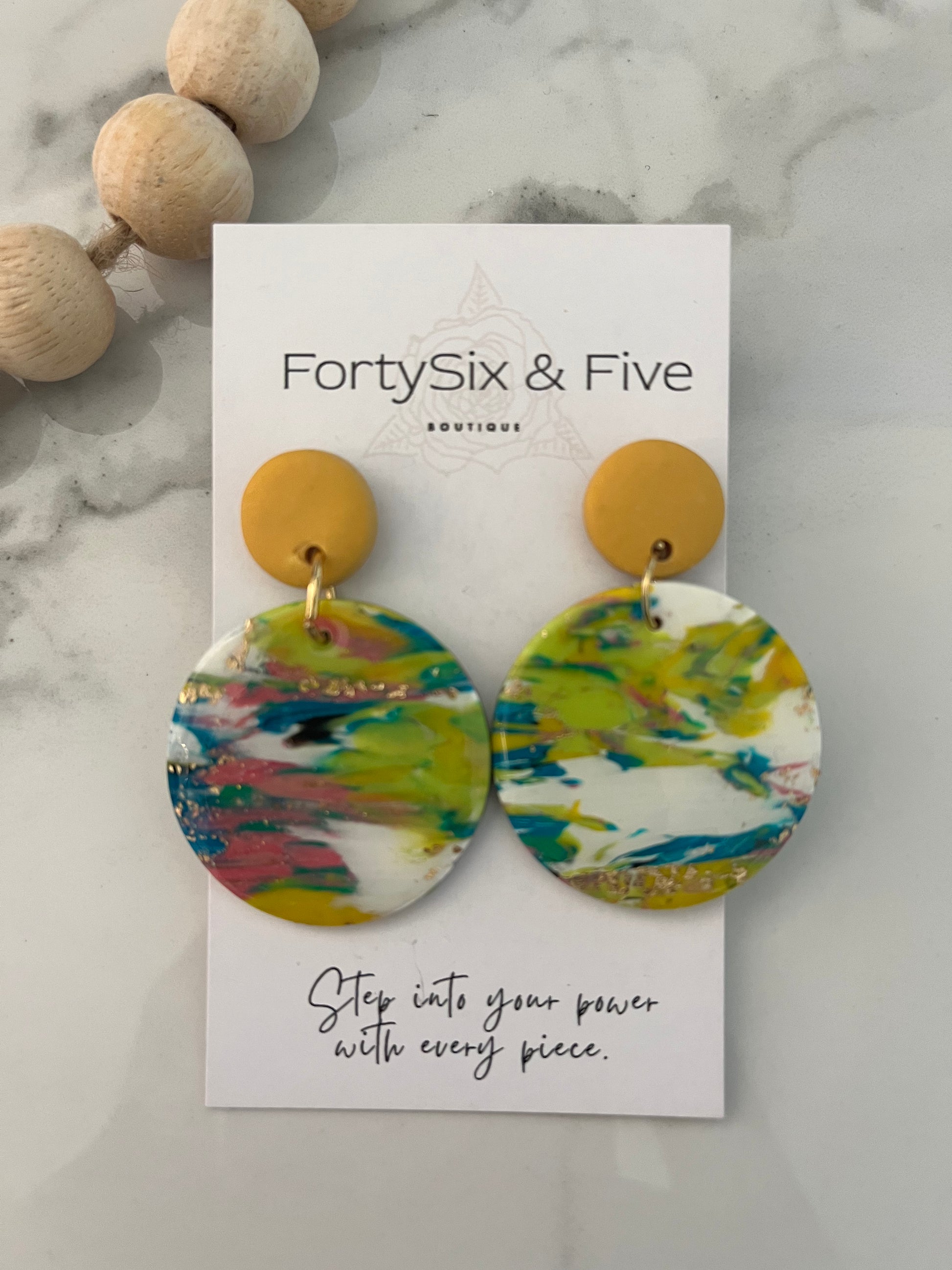 The greens , blues and dashes of pink make this unique earring POP with expression! The yellow topper brings out the beauty in this unique piece. It has been created with love and passion by our owner and creator Taniesha. This is a perfect gift for yourself or someone you love!