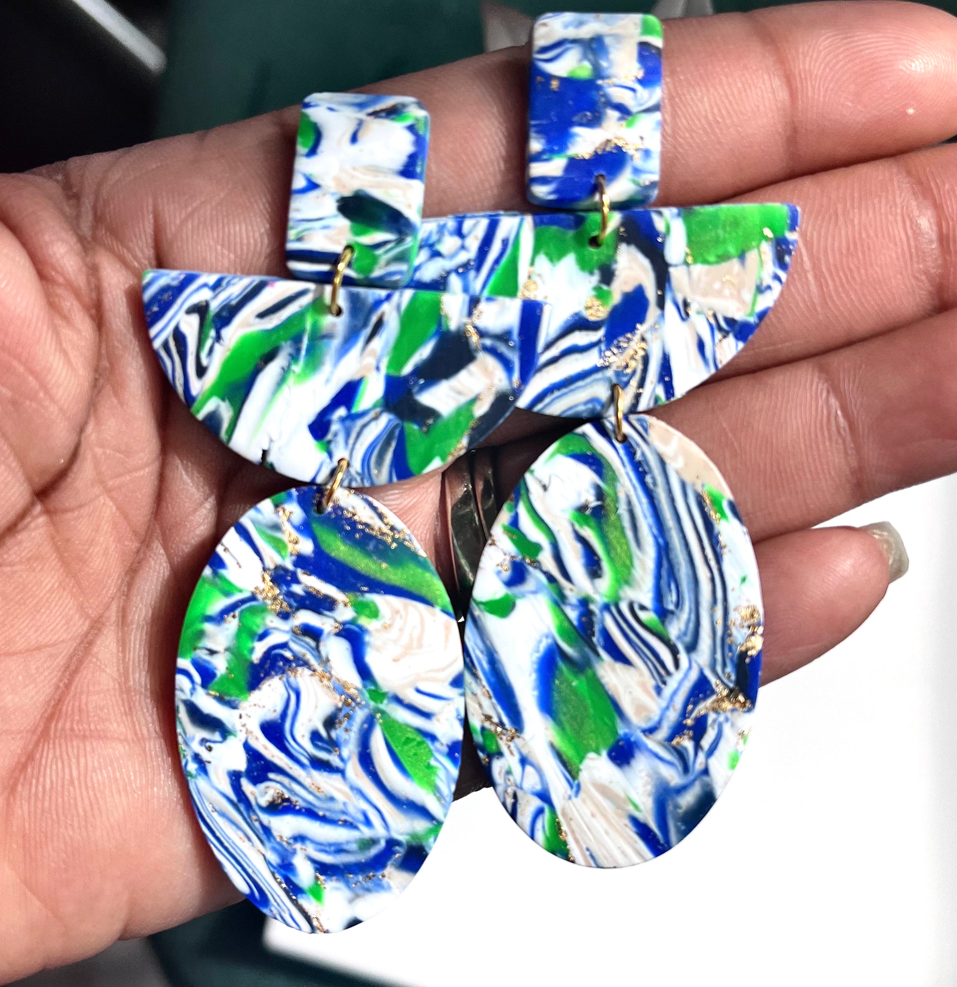 Introducing our Blue, Green and White with gold flecks Polymer Clay Earrings: