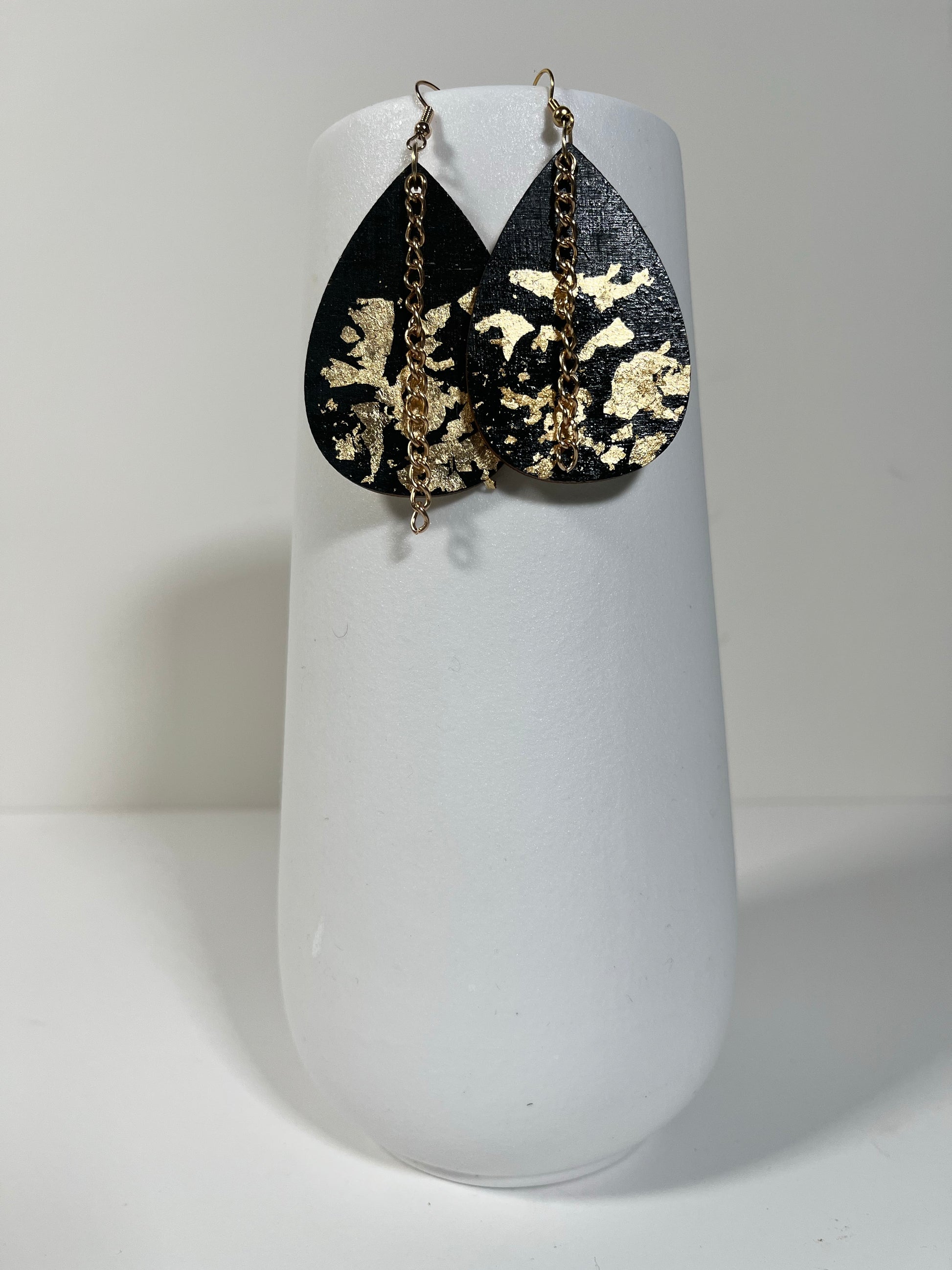 It’s the mystery and gold accents for me in this beautiful painted wooden piece. It hangs at two inches from the lobe and are incredibly lightweight!