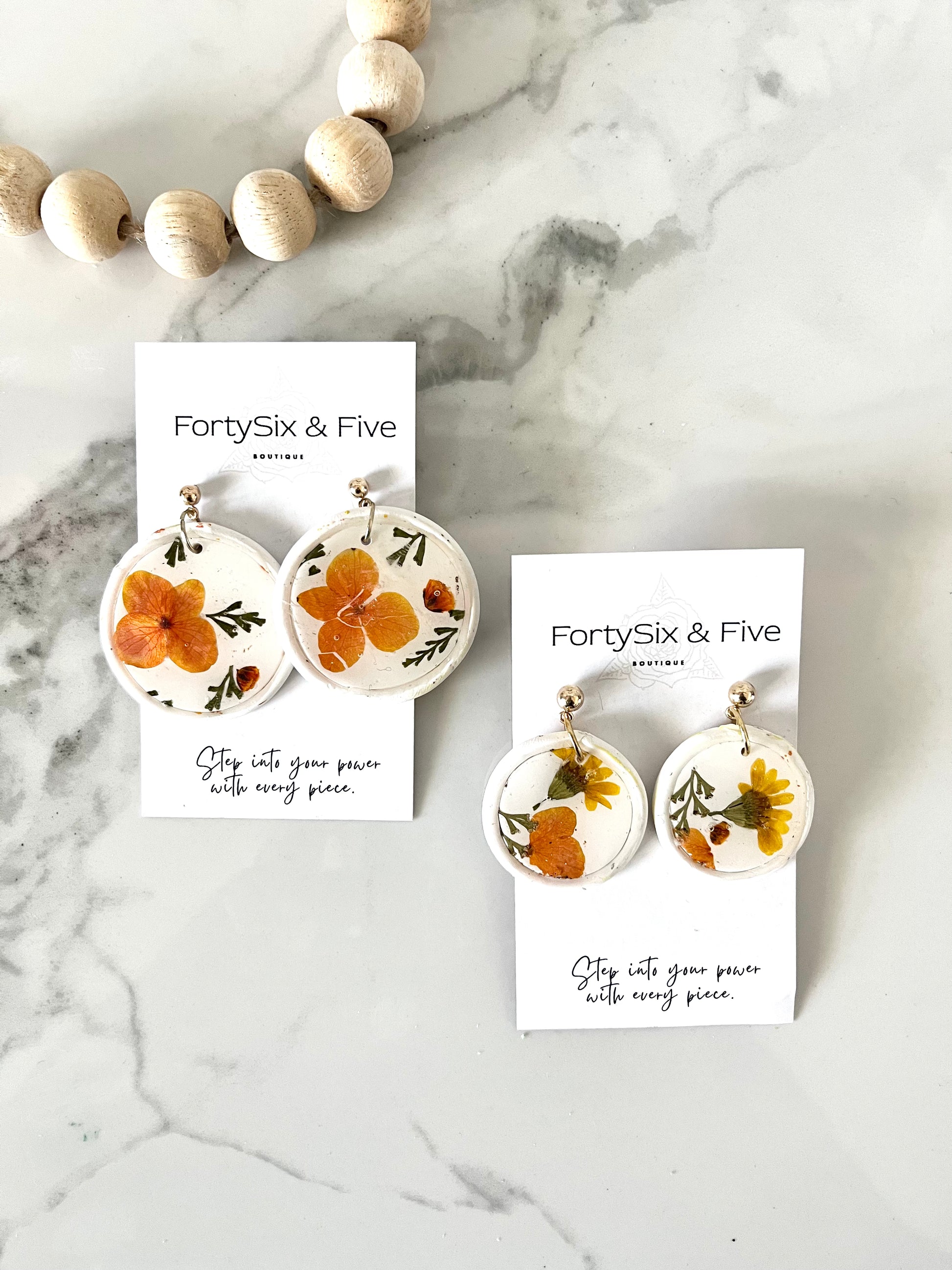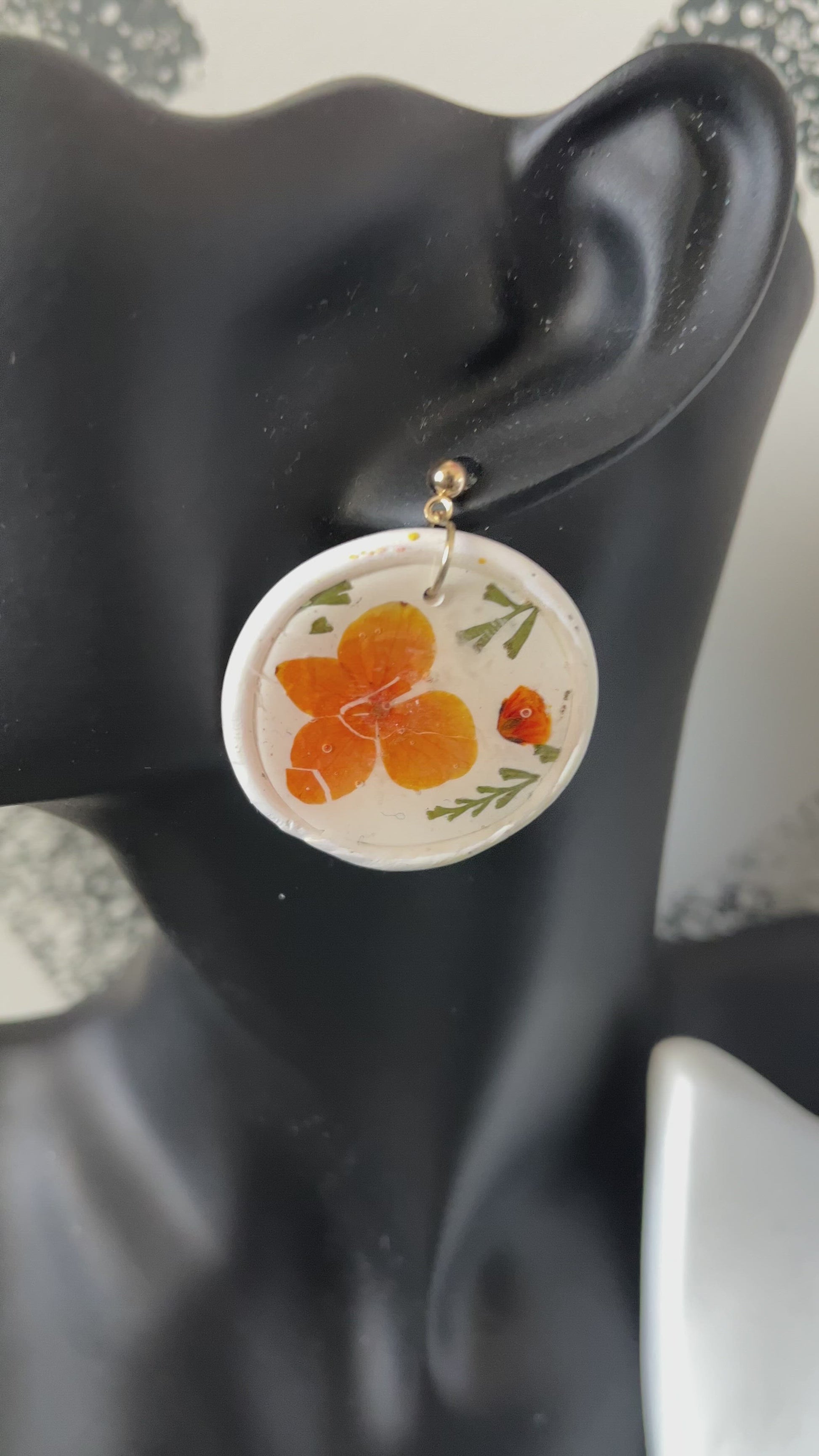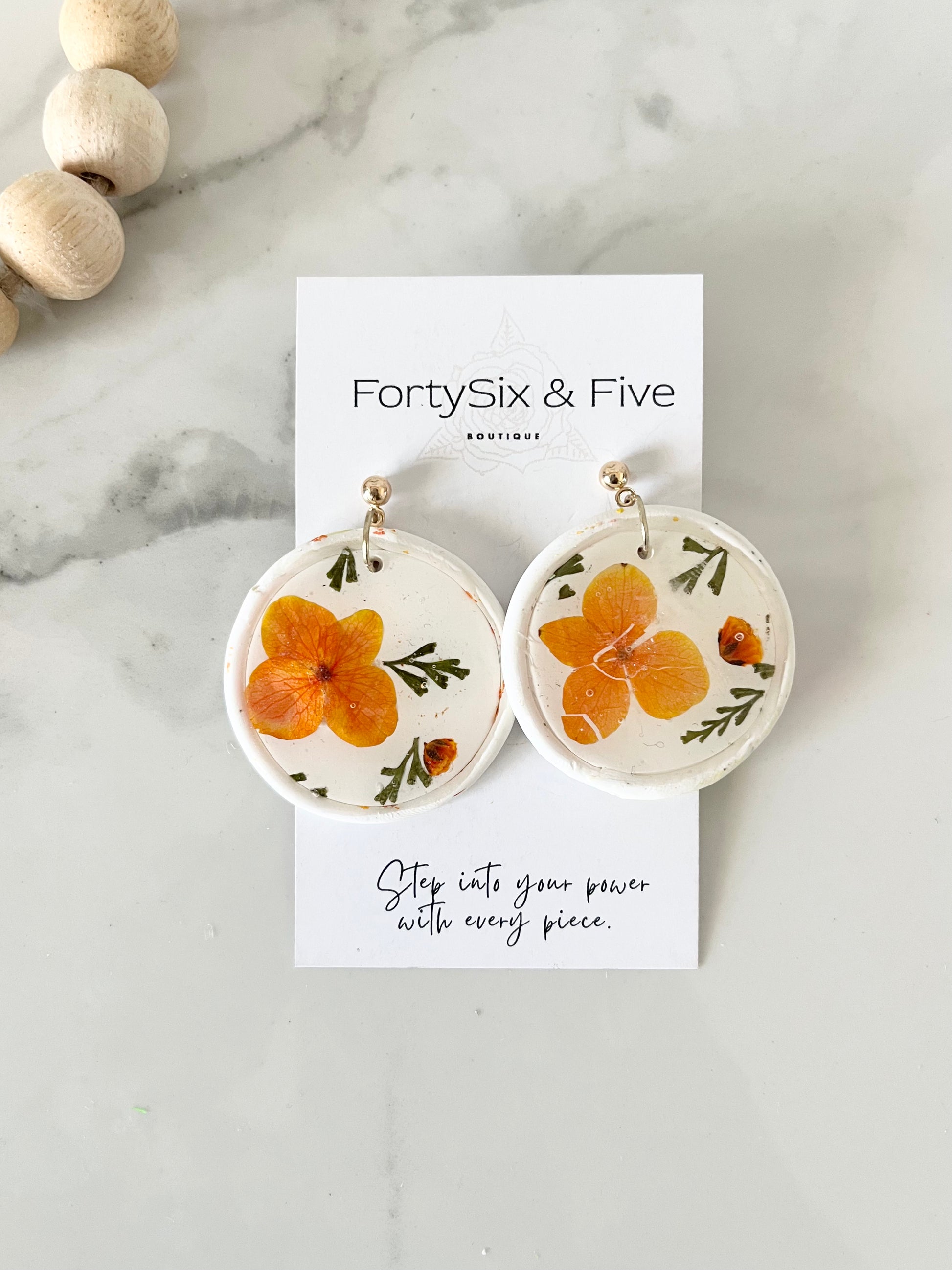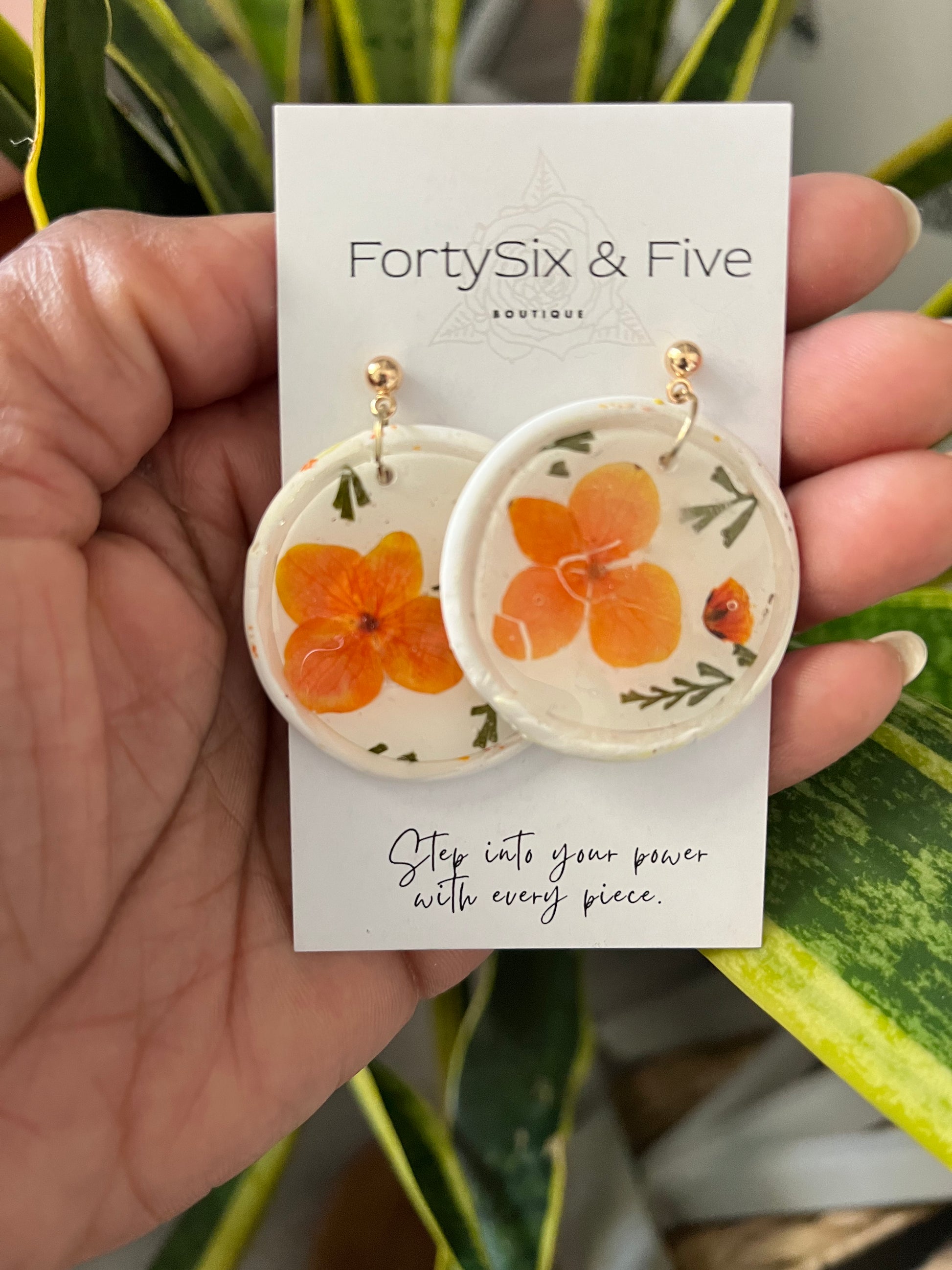 Made with REAL pressed and dried flowers. Orange and yellow leaves adorn the polymer clay to create a beautiful bouquet on your ears without the WEIGHT!