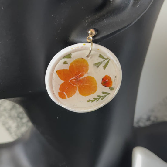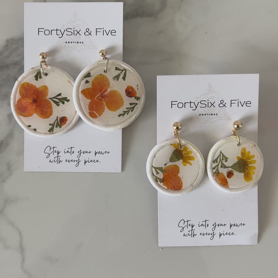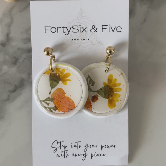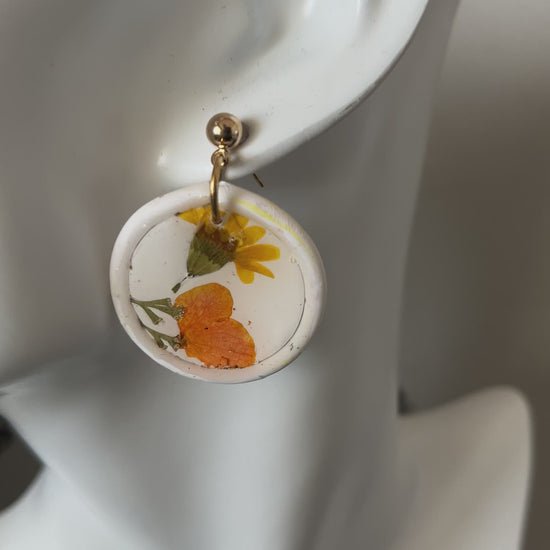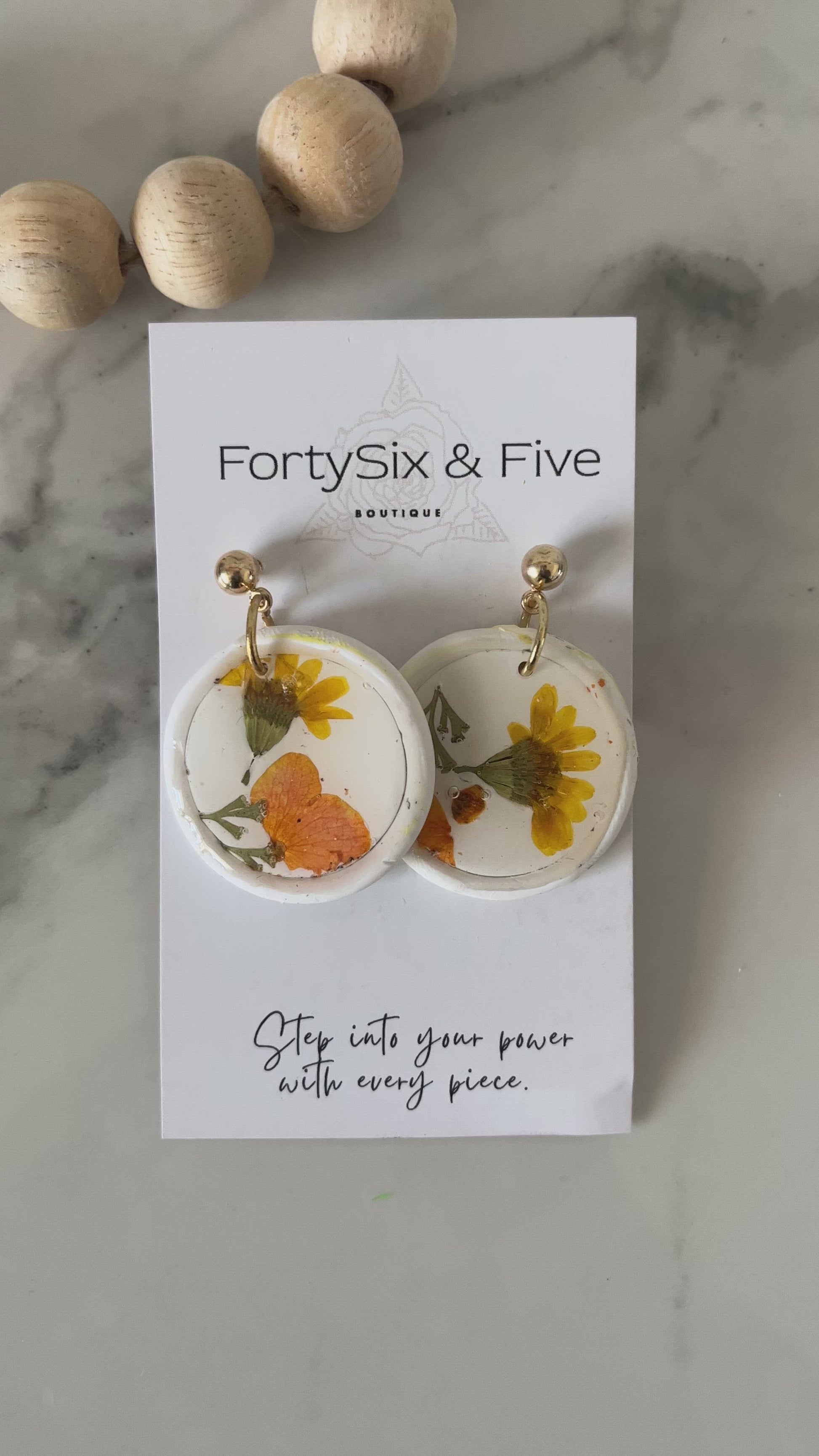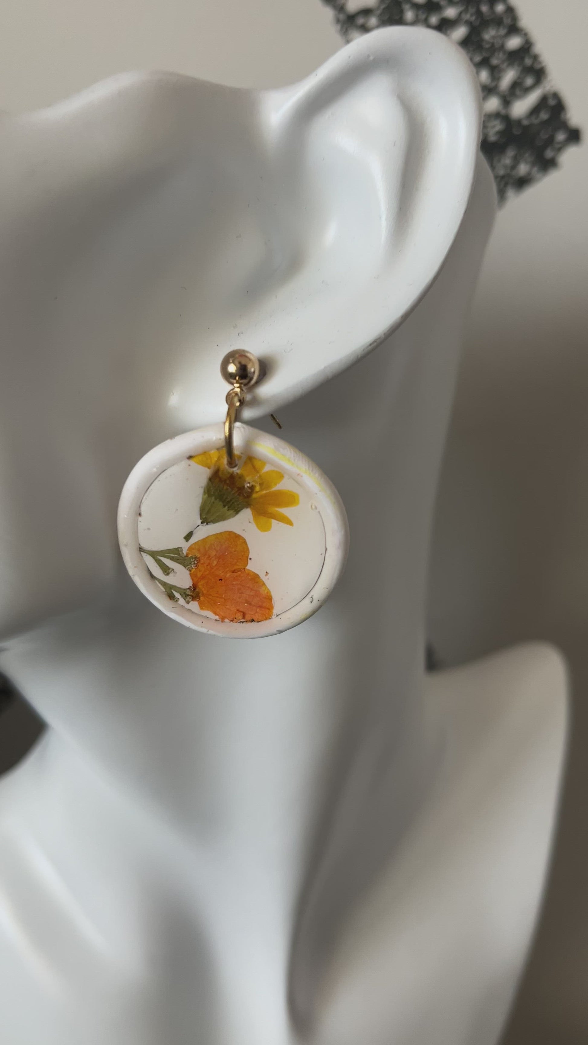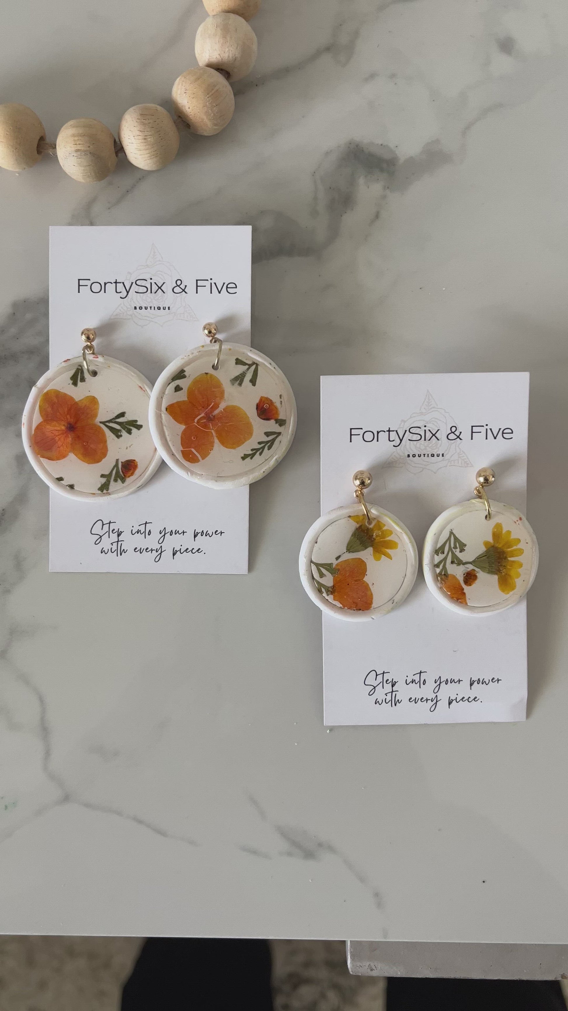 Made with REAL pressed and dried flowers. Orange and yellow leaves adorn the polymer clay to create a beautiful bouquet on your ears without the WEIGHT!