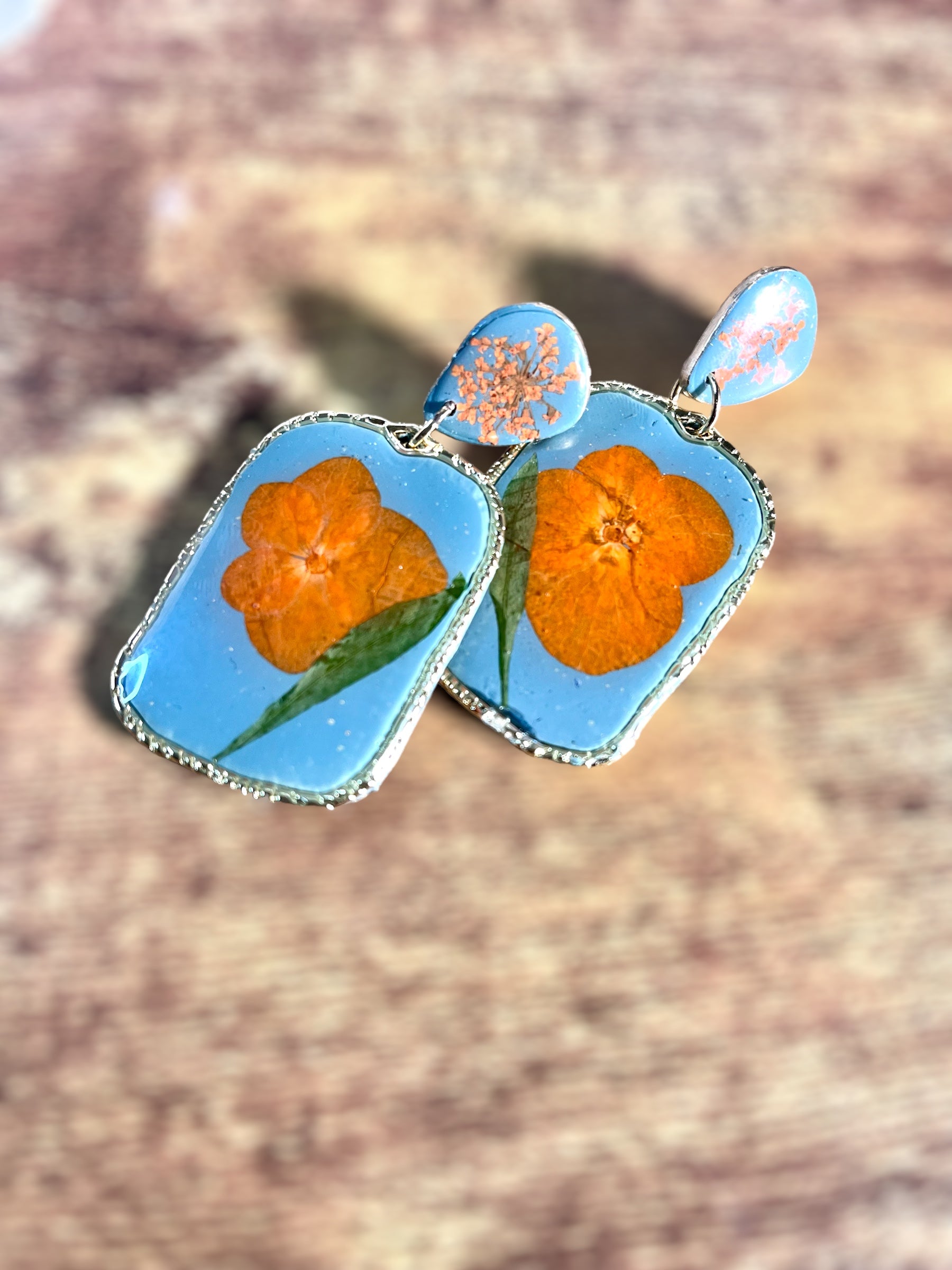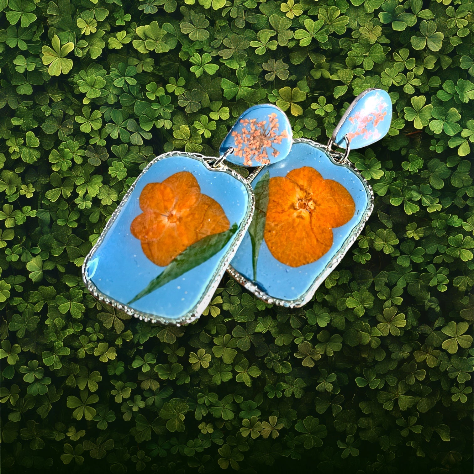 Real pressed flowers are the superstar in this beautiful pair of handmade one of a kind earrings. Set in a gold plated metal frame, these earrings are One of a kind! Get ready to be FLOODED with compliments!