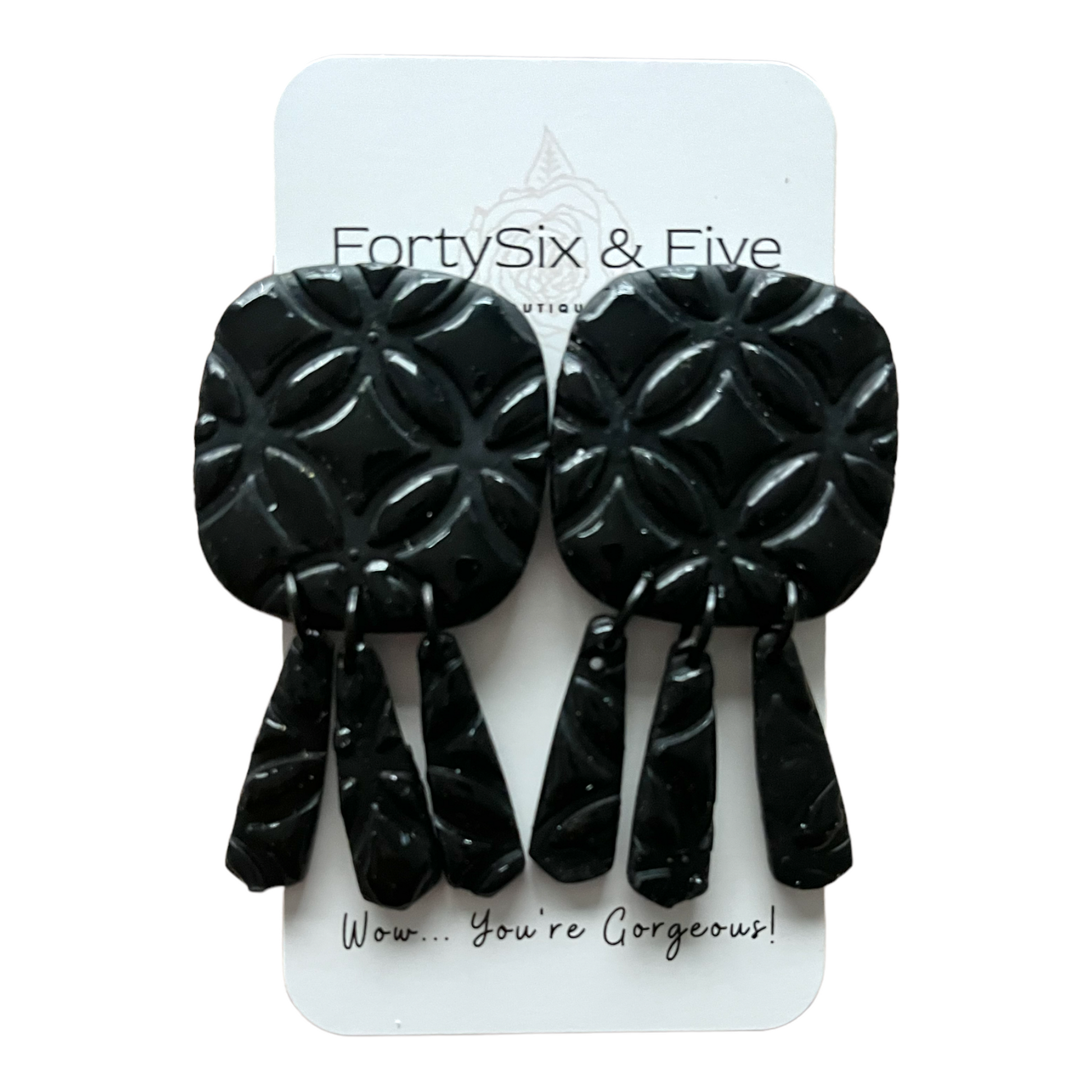 Add a touch of elegance to any outfit with these beautiful Black Posts with Shiny Resin Embellishment from the Her Story Collection by Fortysixandfive! Measuring 3 inches in length, these polymer clay earrings are not only stylish but also hypoallergenic and nickel-free, ensuring comfort all day long. The shiny resin embellishments add a subtle pop of sophistication, elevating any outfit. Embrace your love for black history and add a touch of class to your accessory game with these stunning earrings. With only one pair available, don't miss out on this unique and one-of-a-kind piece. Shop now and make a statement with the Black Posts with Shiny Resin Embellishment."