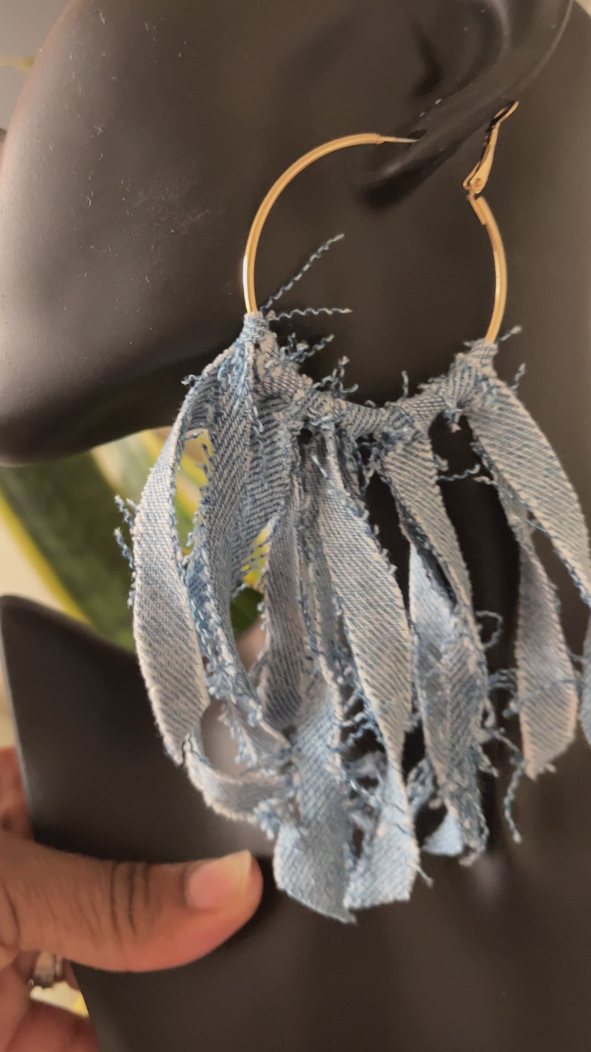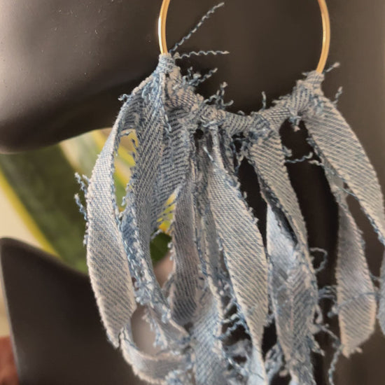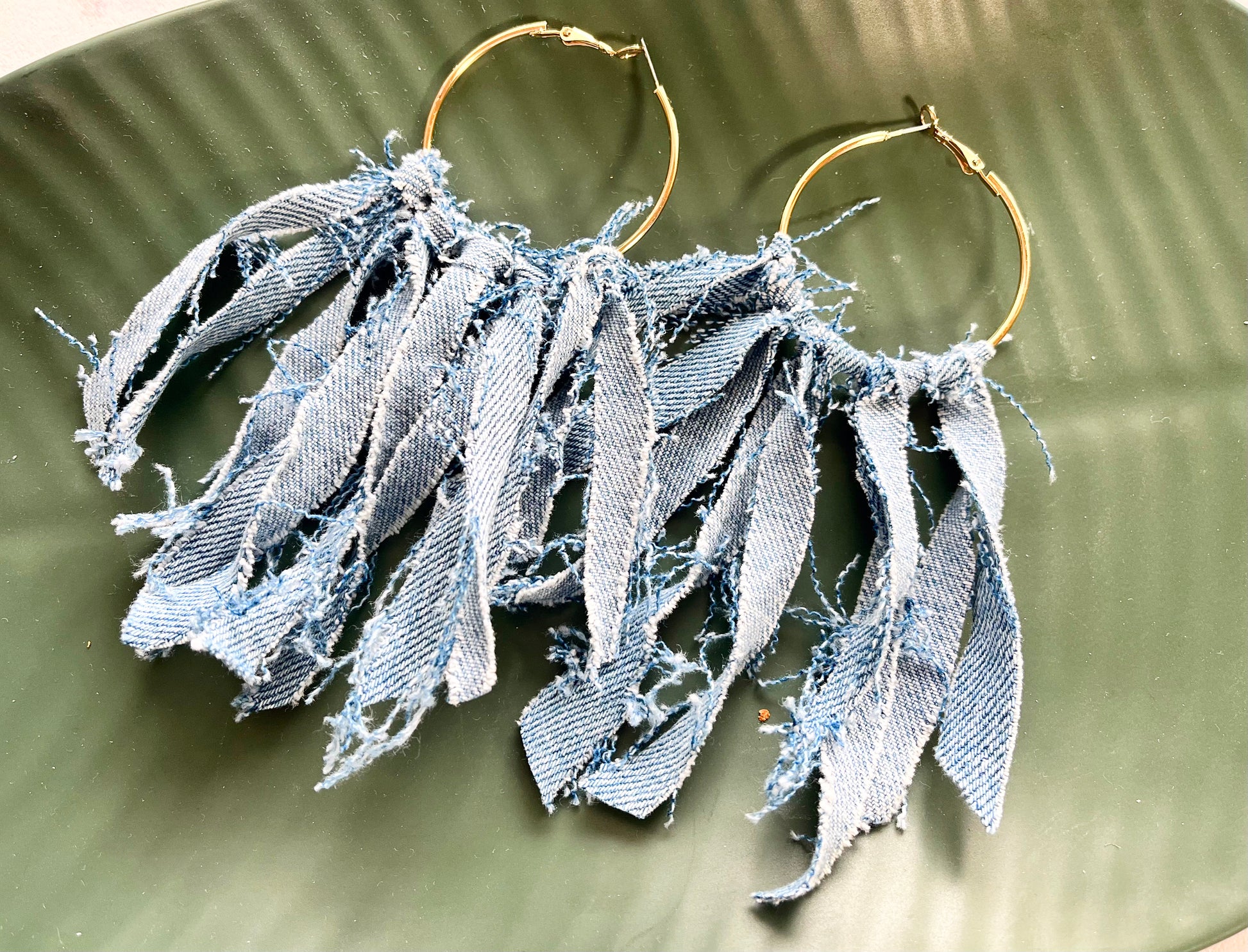 Our “ I Dream Of Jeanie” Halo denim earrings are a crowd pleaser! Made with 100% stone washed denim and gold plated nickel free golden hoops, they are lightweight and stunning!