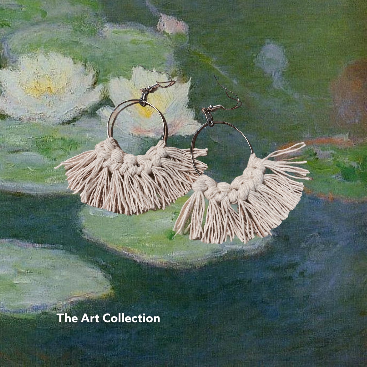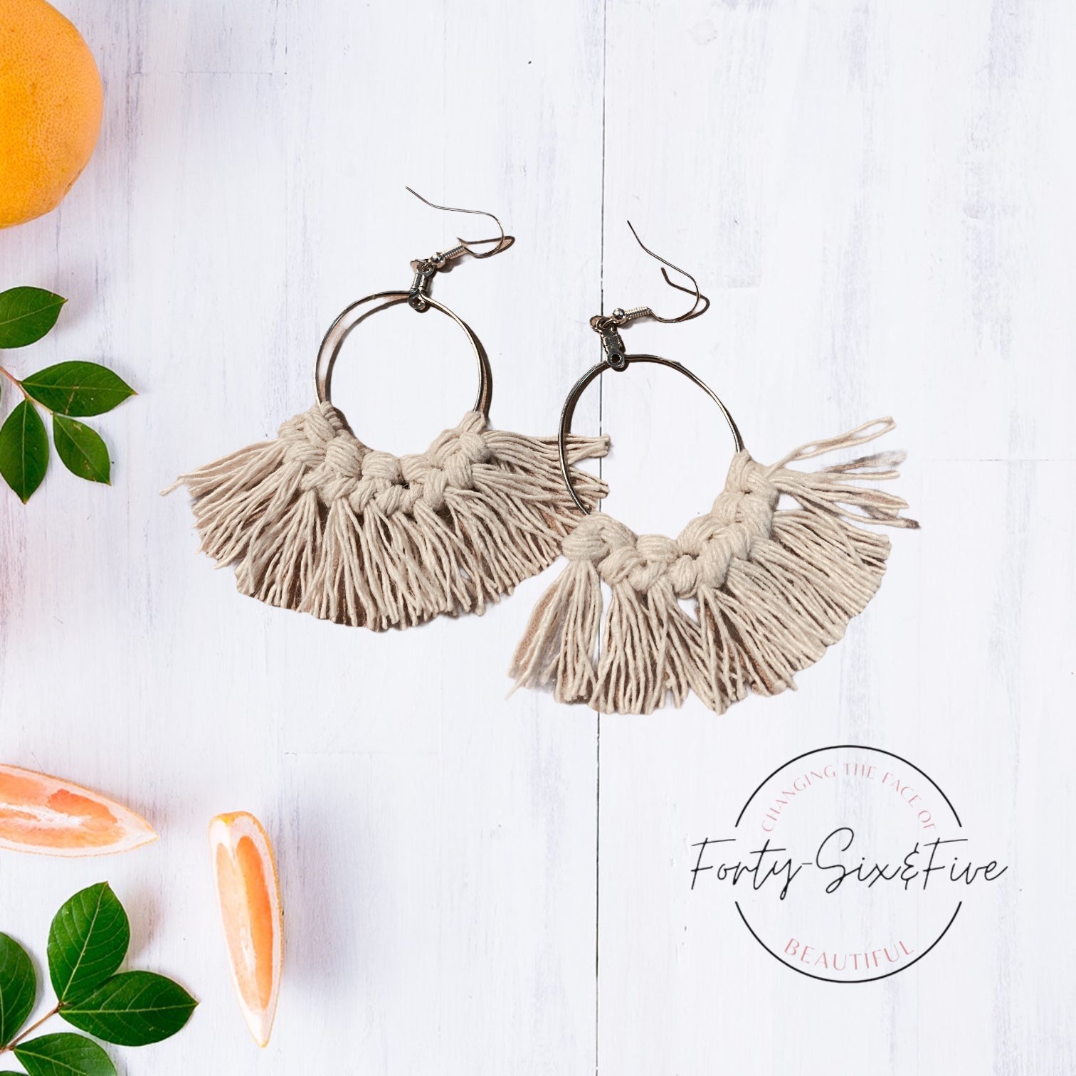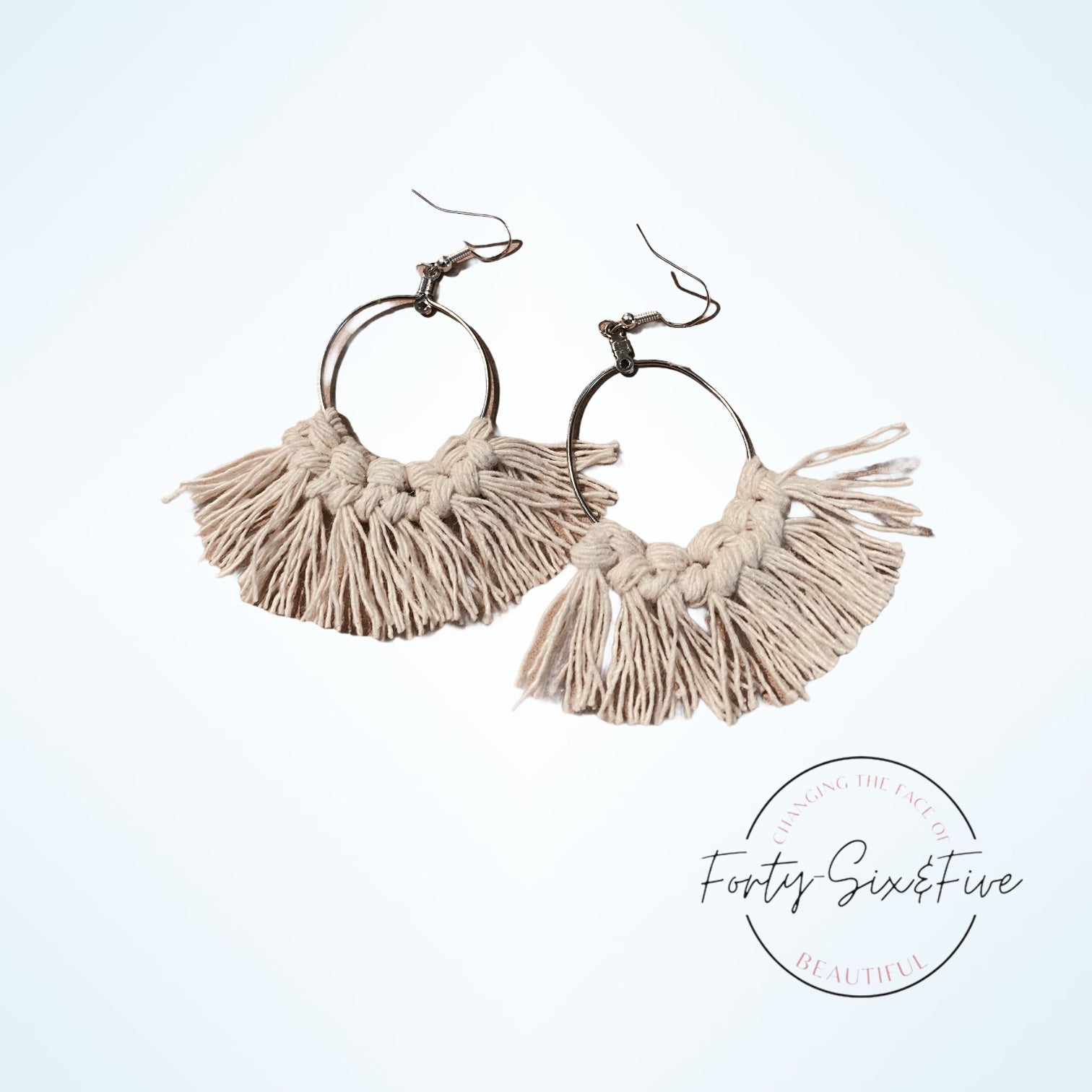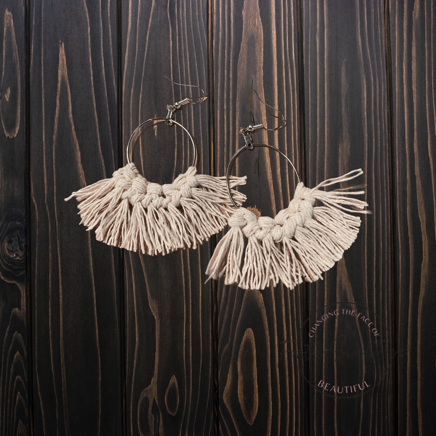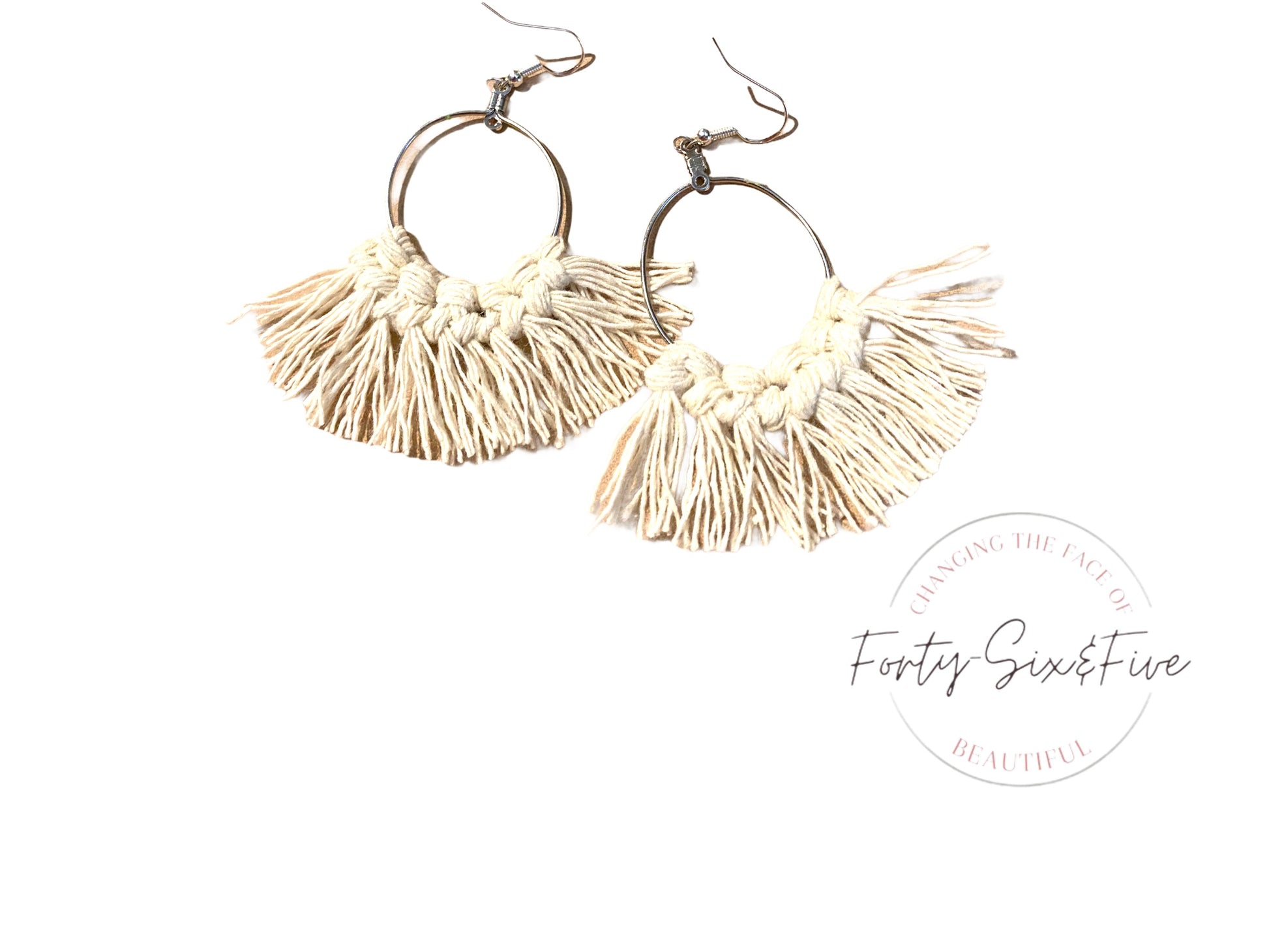 These earrings were made with macrame chord. These unique fines go perfectly with any outfit. They can be dressed up or down to become the perfect accessory to any outfit.