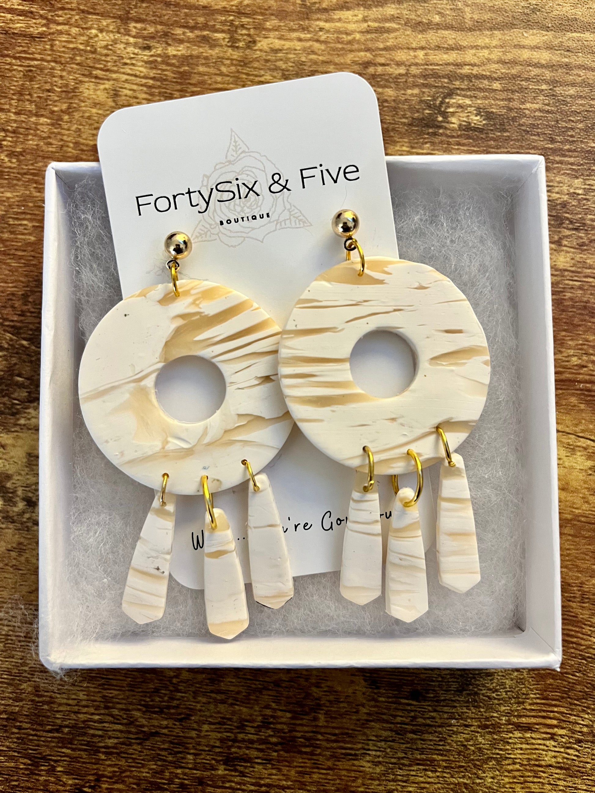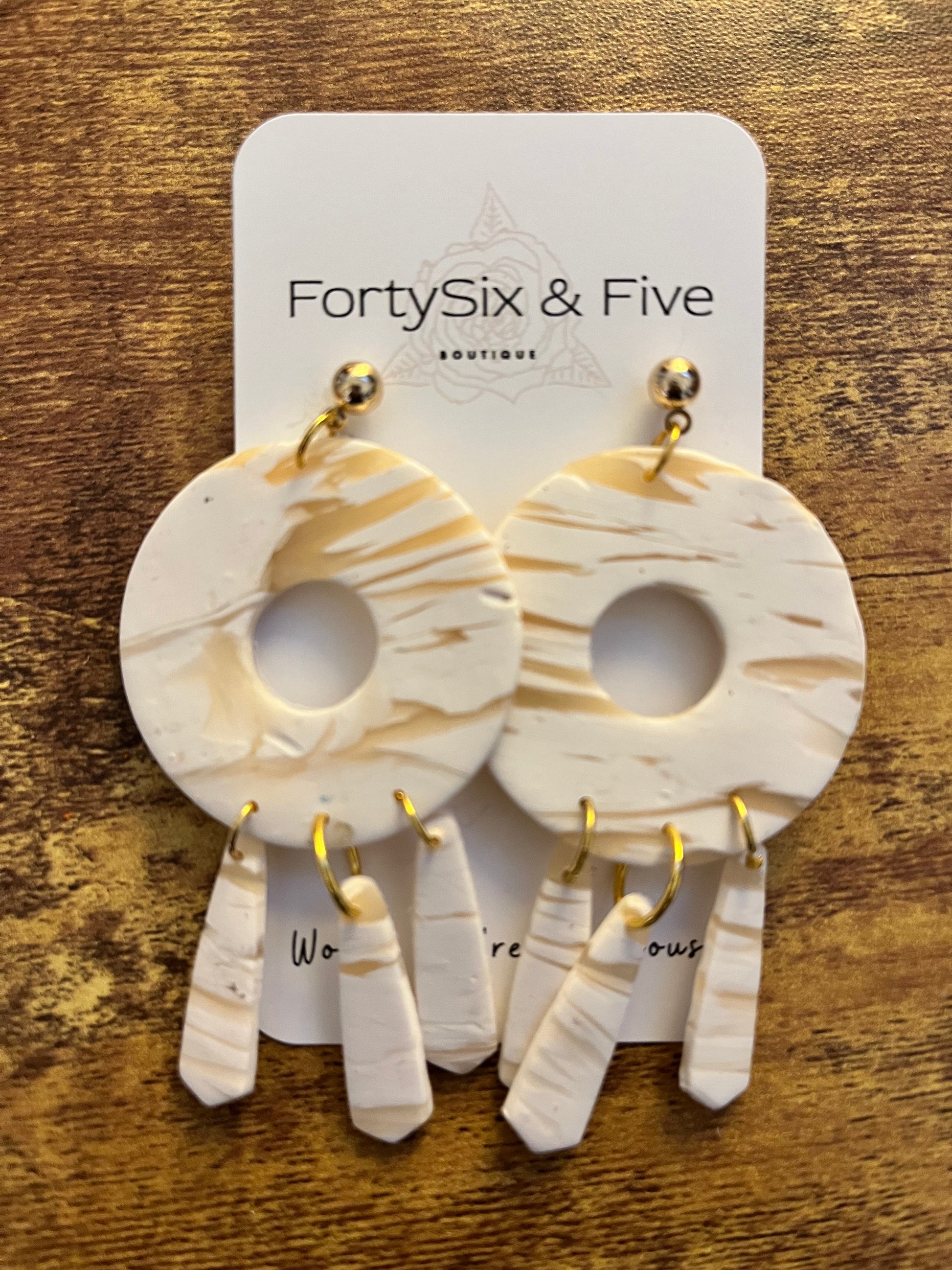 Mandy is stunning with her neutral vibe and stylish shape! Girl… can you say PERFECT?!! Get ready to turn heads with the one-of-a-kind earrings! These handmade wooden earrings are a stunning 2.5 inch long and gorgeous translucent and white designs.