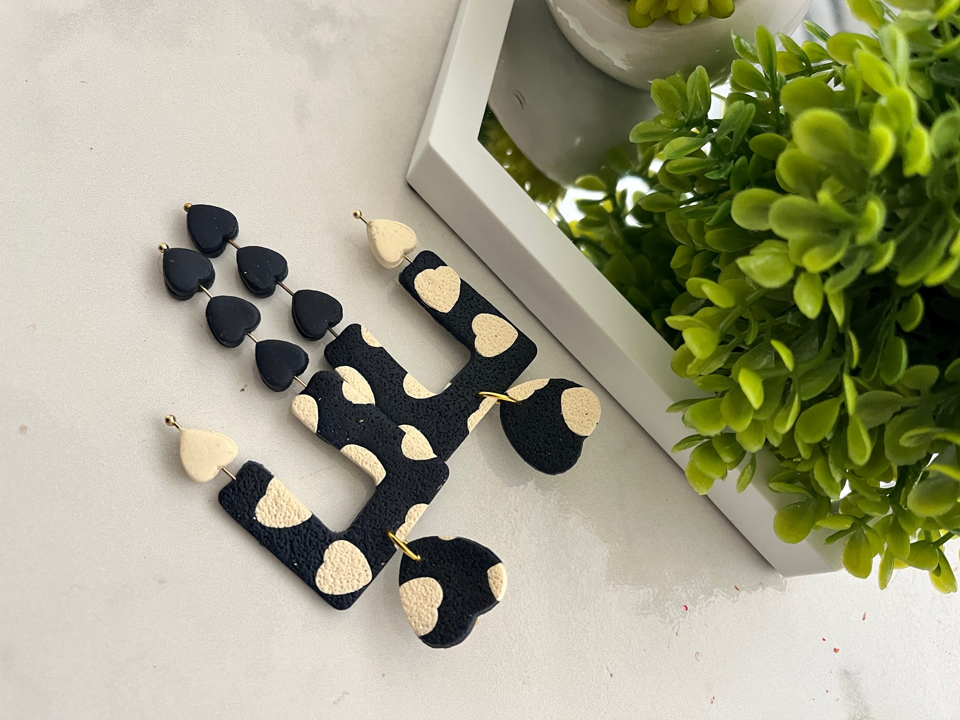 Hey there party people! Are you ready to add some serious romance to your wardrobe? Introducing our new 4-inch navy and cream polymer clay earrings, perfect for Valentine's Day and beyond. These babies are sure to make a statement with their bold pink and red color scheme and gold chain accents. Plus, they're lightweight and comfy to wear all day long.