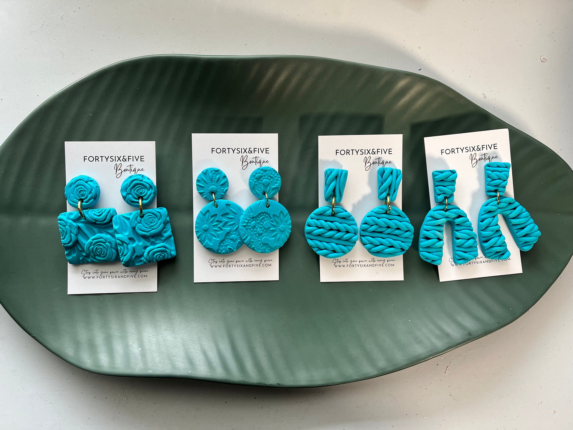 these are hand stamped and hand braided polymer clay turquoise blue earrings!
