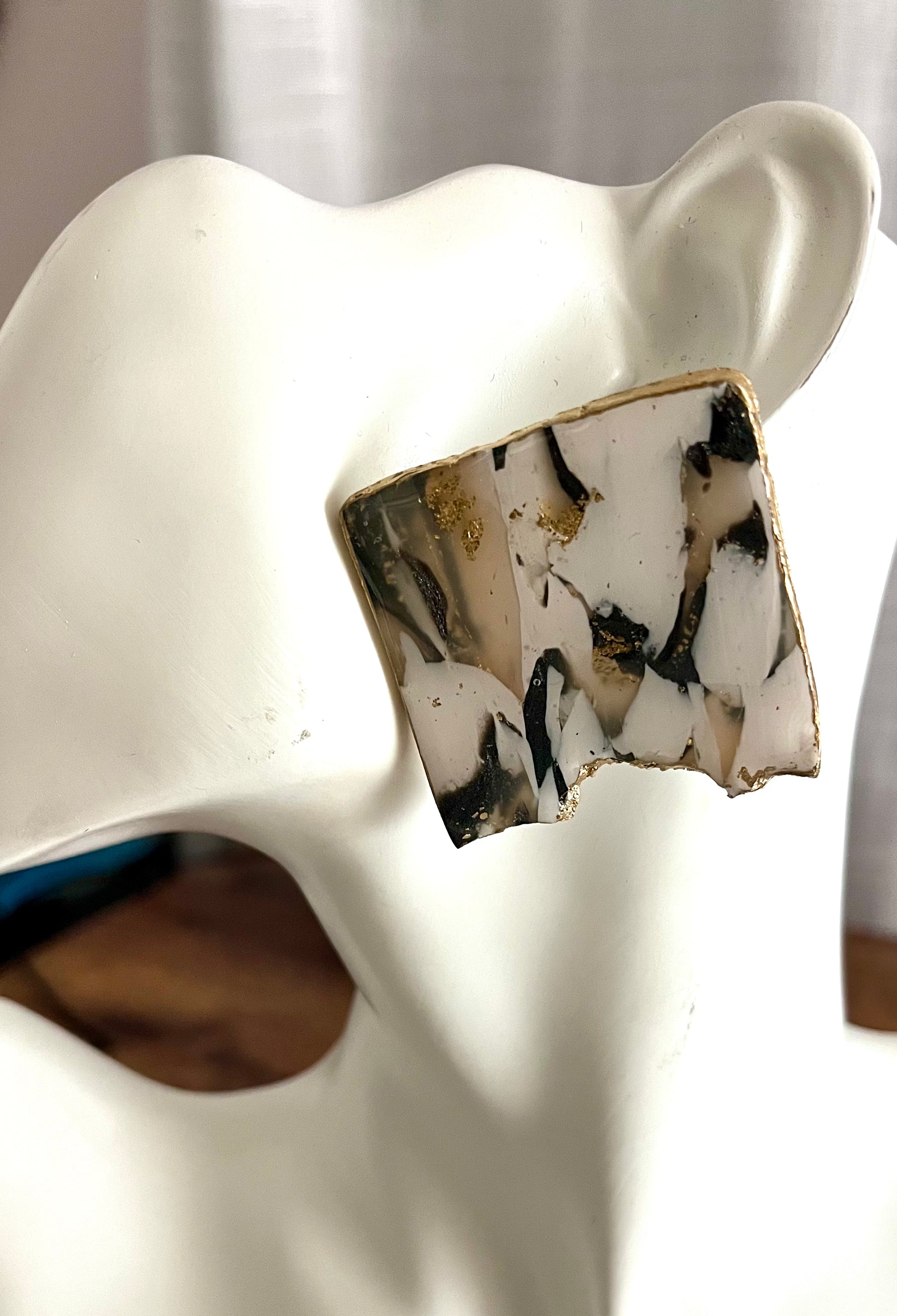 Don't be afraid of these. They are bold, beautiful and lightweight. They measure one and 1/ half by one and 1/ half inches. Nobody will have these and you are going to stand out and look so beautiful. Step out in style with our Prosperity midnight glamour dangles! Made with lightweight polymer clay and featuring translucent accents, these earrings add a touch of elegance to any outfit. The dark gray and gold accents hang from the ear, making them both beautiful and comfortable to wear. Set up your new year, right with the right, kind of style, the right kind of earrings, and be set apart from the rest