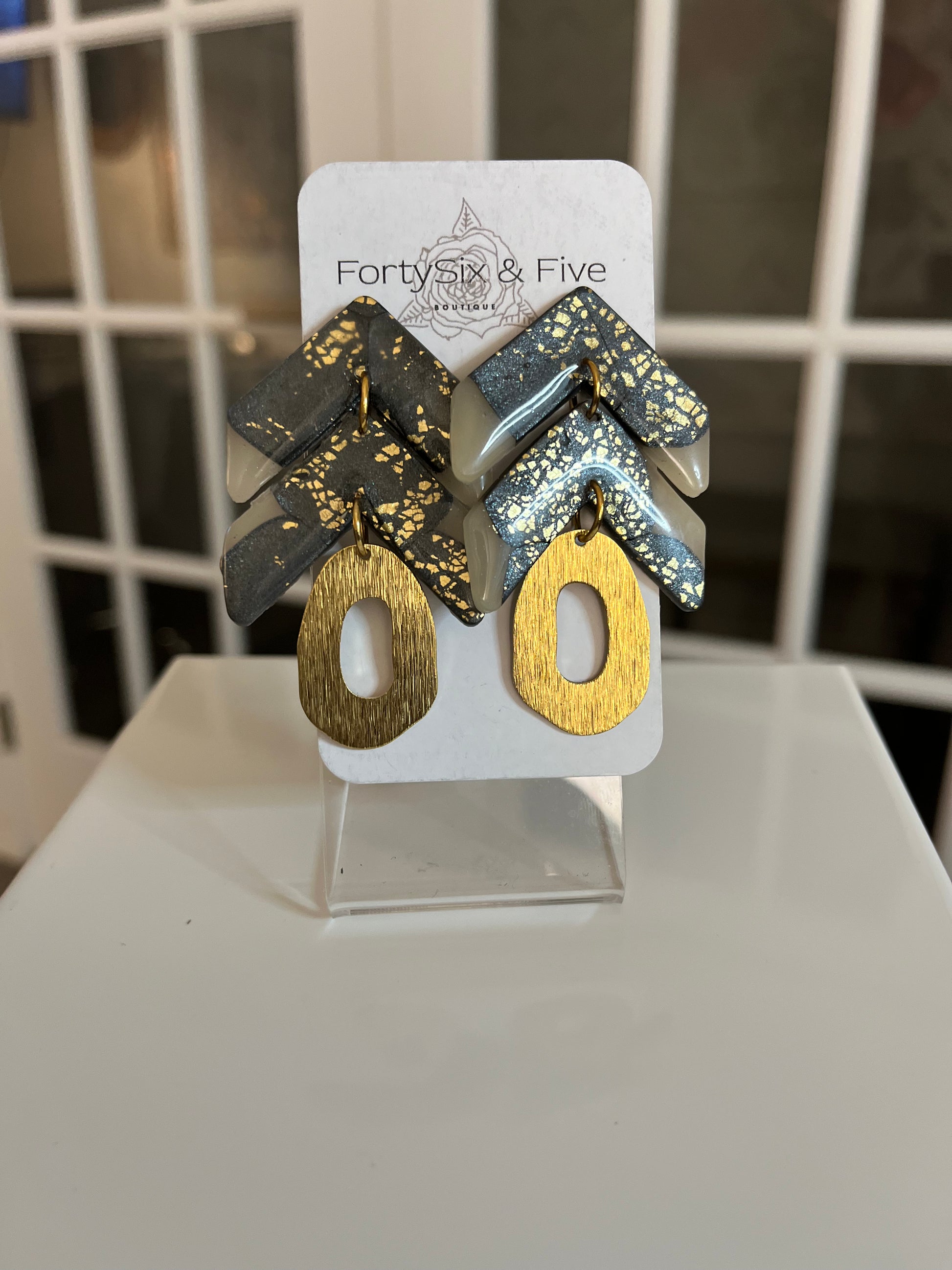 Step out in style with our Prosperity midnight glamour dangles! Made with lightweight polymer clay and featuring translucent accents, these earrings add a touch of elegance to any outfit. The dark gray and gold accents hang from the ear, making them both beautiful and comfortable to wear. Set up your new year, right with the right, kind of style, the right kind of earrings, and be set apart from the rest