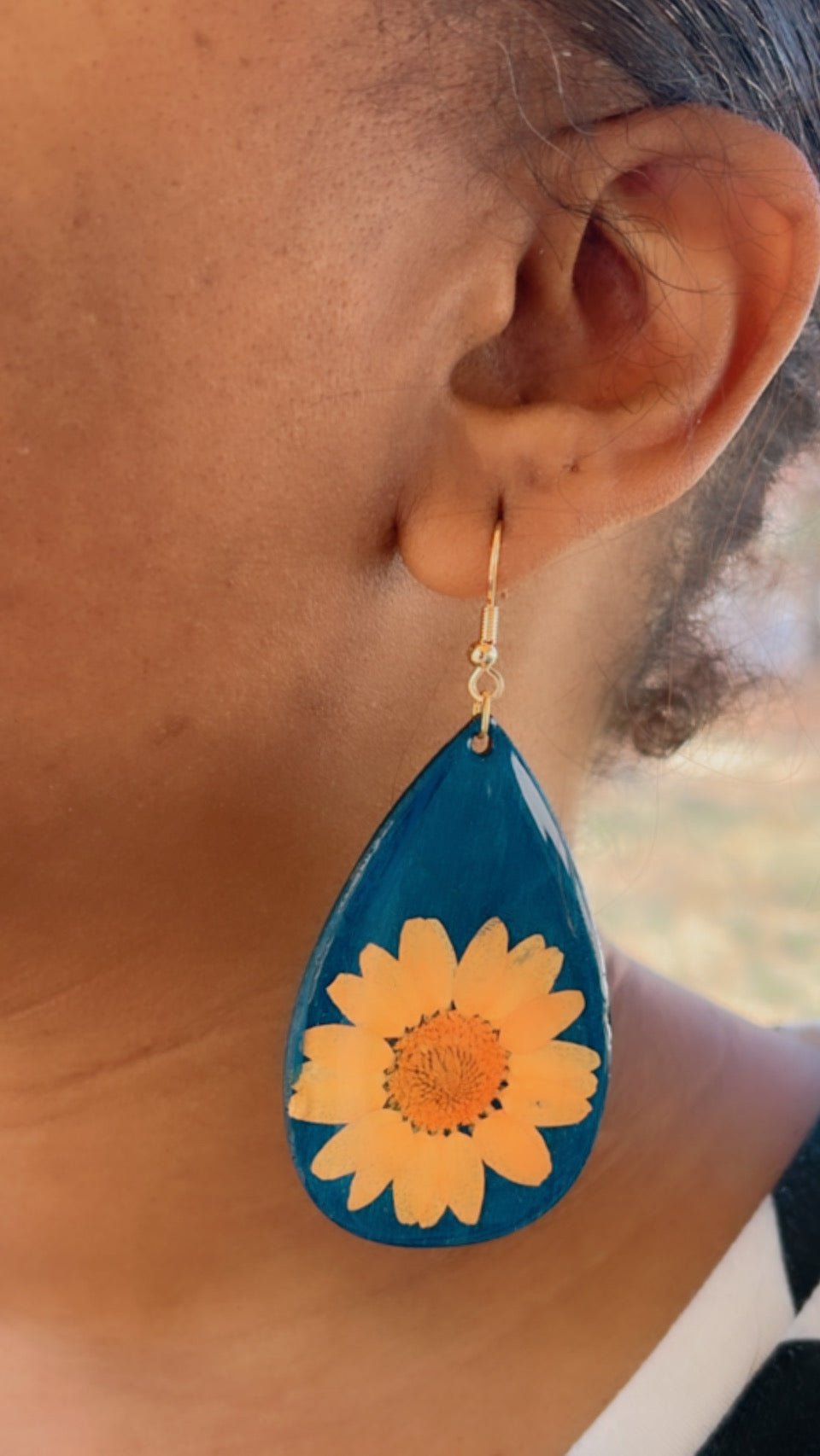 Where are my blue girls and denim girlies?💙💙💙💙Get ready to turn heads with the one-of-a-kind earrings! These handmade wooden earrings are a stunning 2 inch long and feature gorgeous yellow pressed flower accents.