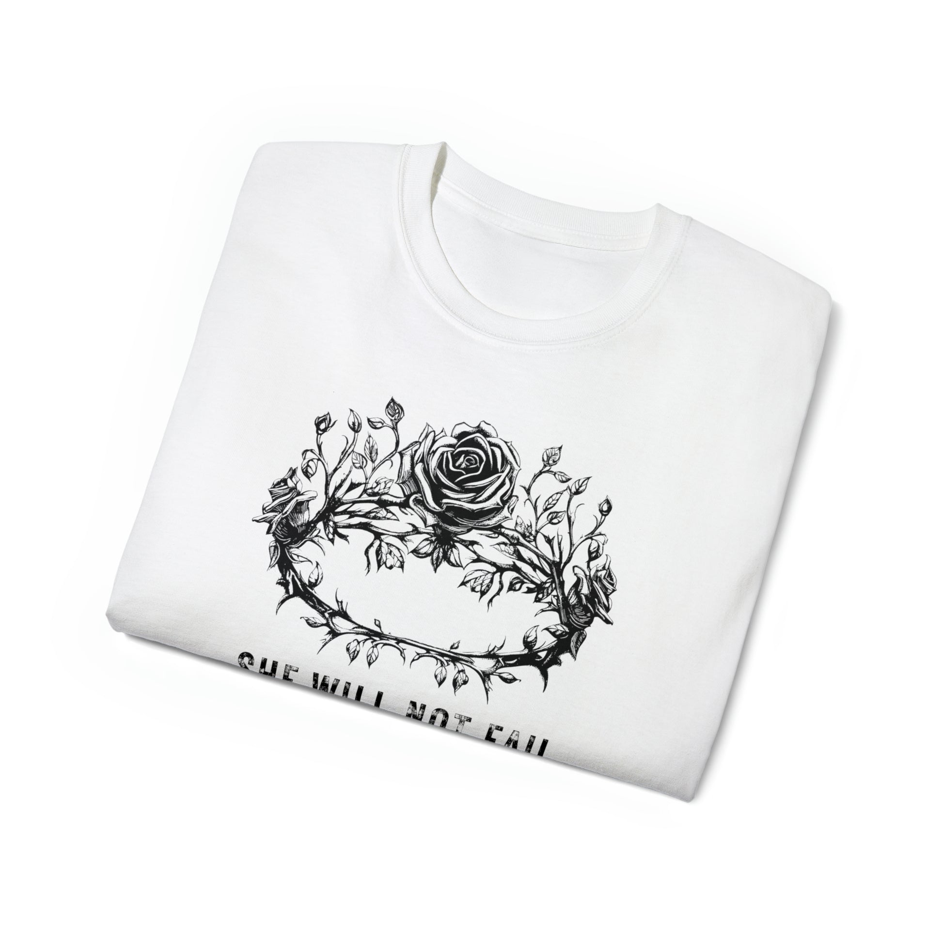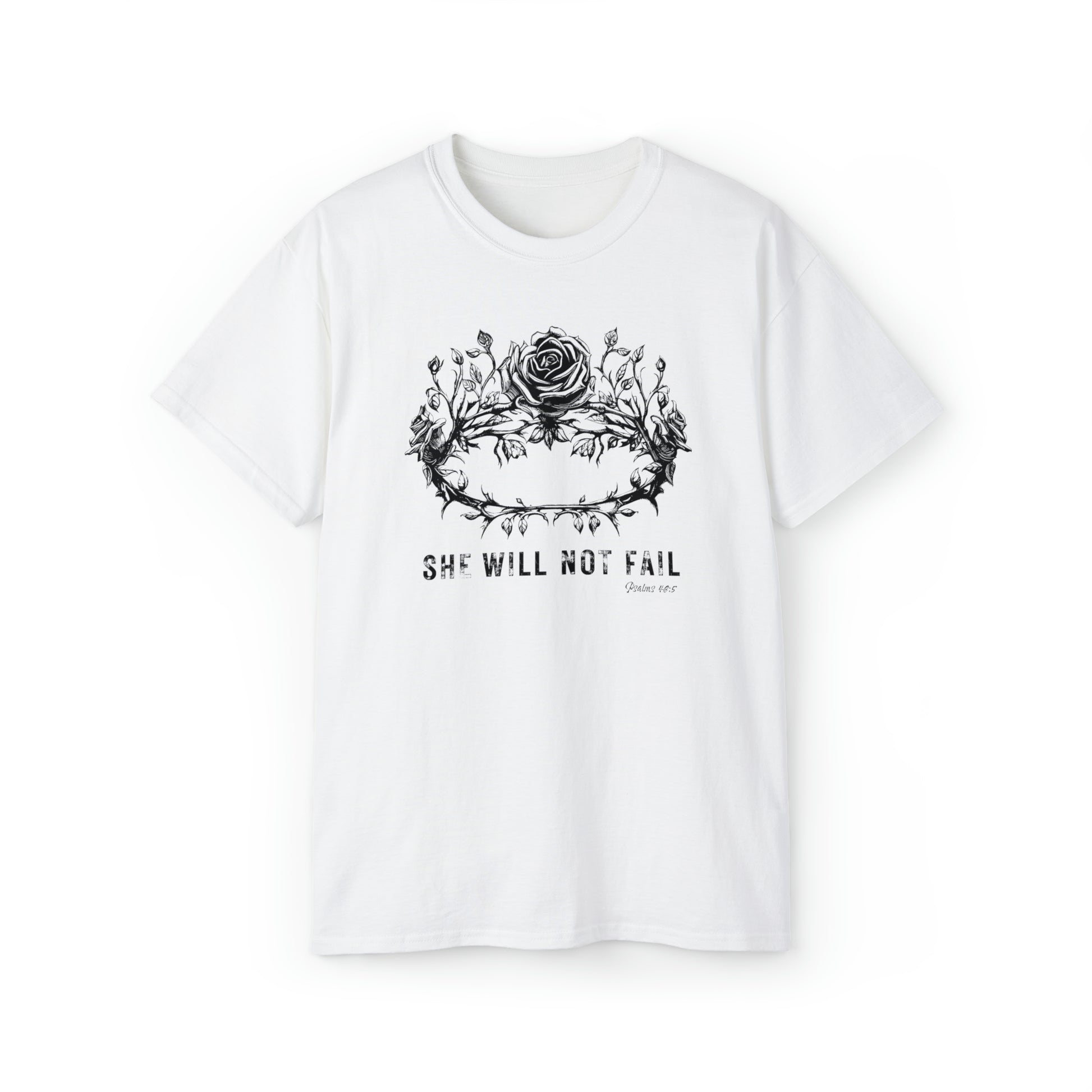 Introducing our empowering "She Will Not Fail" Tee Shirt, a tribute to the indomitable strength and resilience of women. Inspired by Psalms 46:5, this shirt carries a profound message of courage and determination. The exquisite rose crown symbolizes not just victory, but the unwavering power that defines a woman's spirit. Wear it proudly as a reminder of your inner strength that comes from GOD.. and your ability to conquer any challenge that comes your way. Let the world know that failure is not an option – you are a force to be reckoned with. Embrace your strength, embrace your victory, with our She Will Not Fail Tee Shirt.